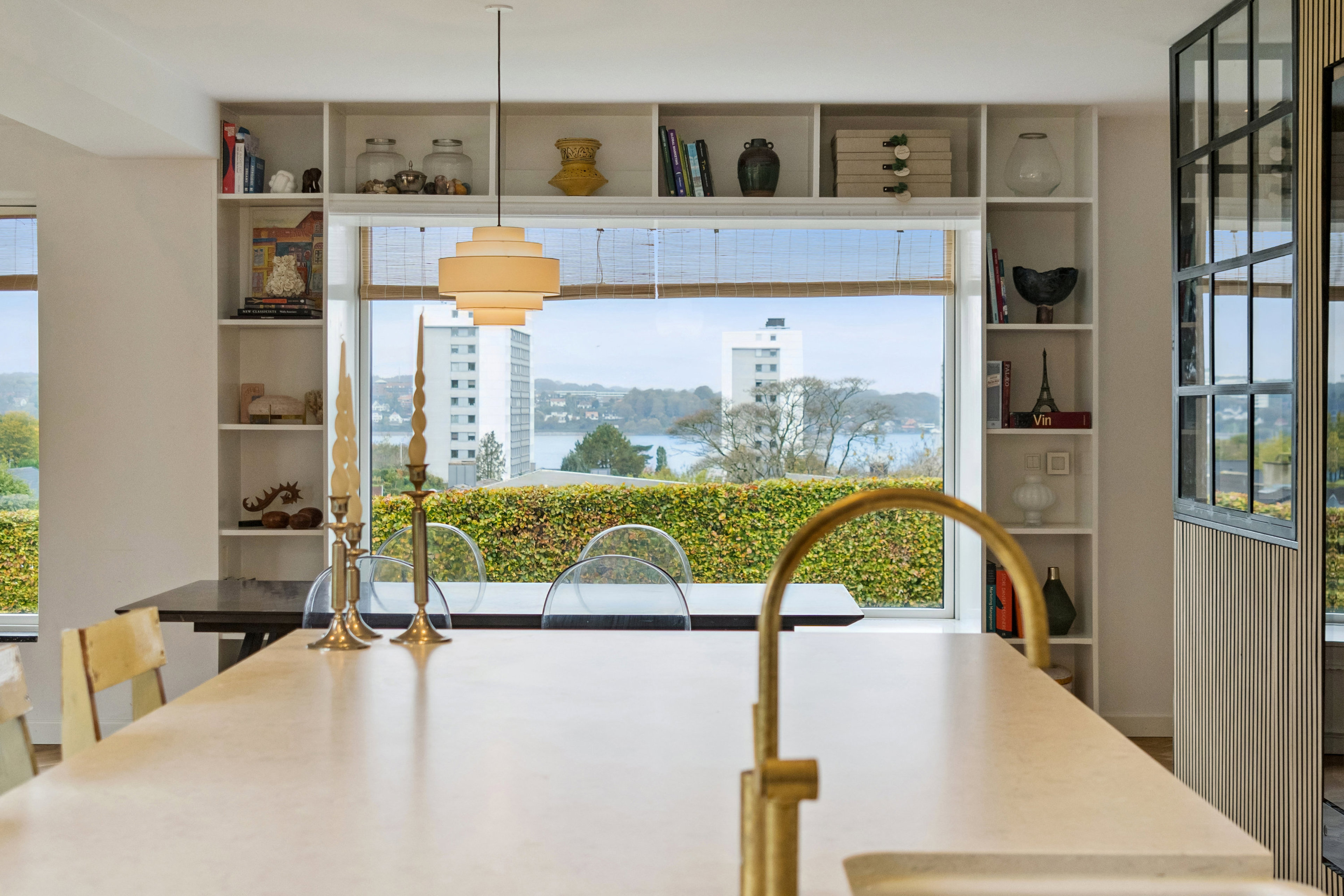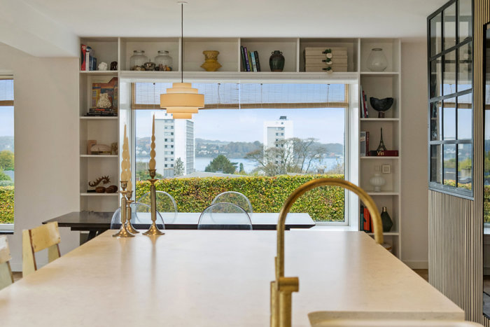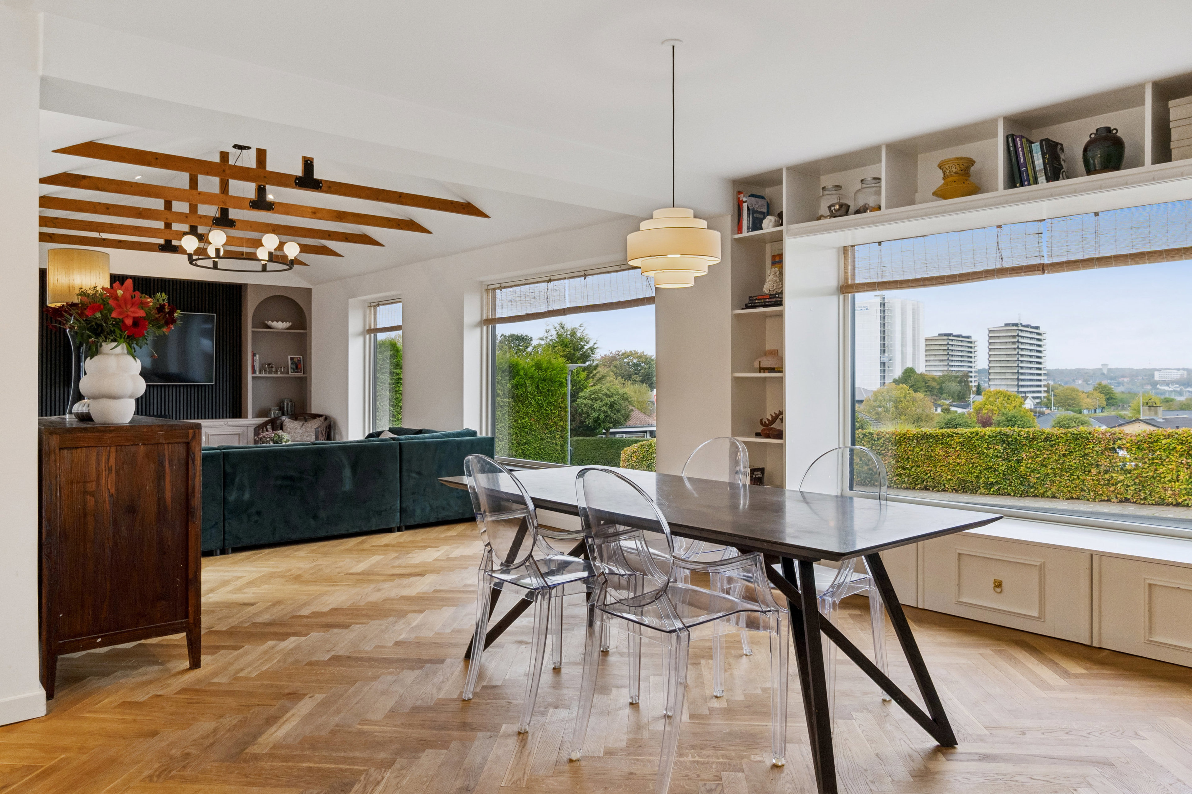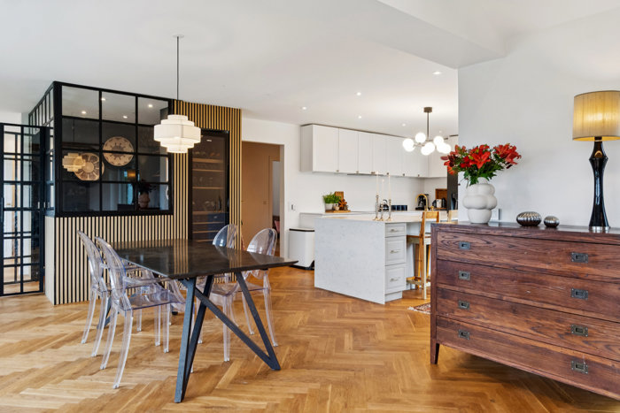 Overalt opleves en elegant stil med smukke sildebensparketgulve, lyse farver og et behageligt lysindfald, som skaber en rolig og harmonisk atmosfære.
