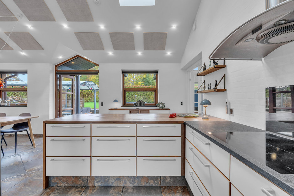 Centralt køkken/alrum med godt lysindfald og udgang til vestvendt terrasse.