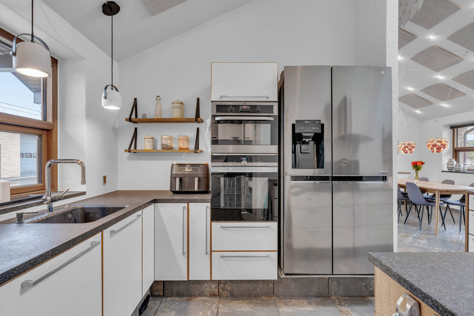 Køkken med halvmur til alrum og adgang til stort bryggers.'