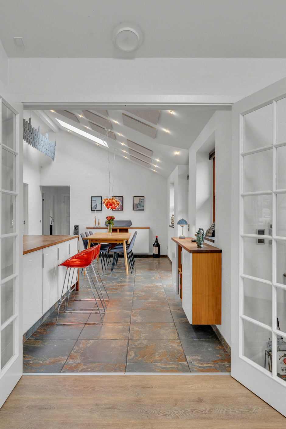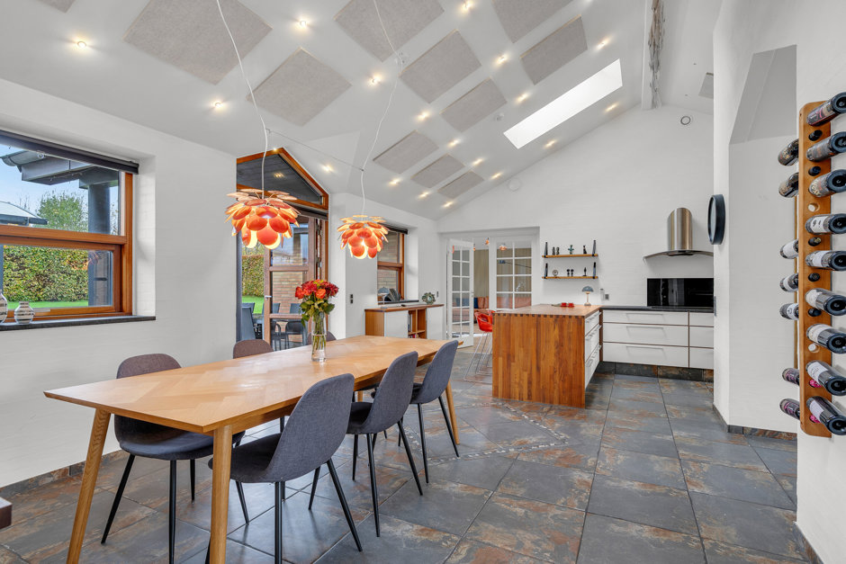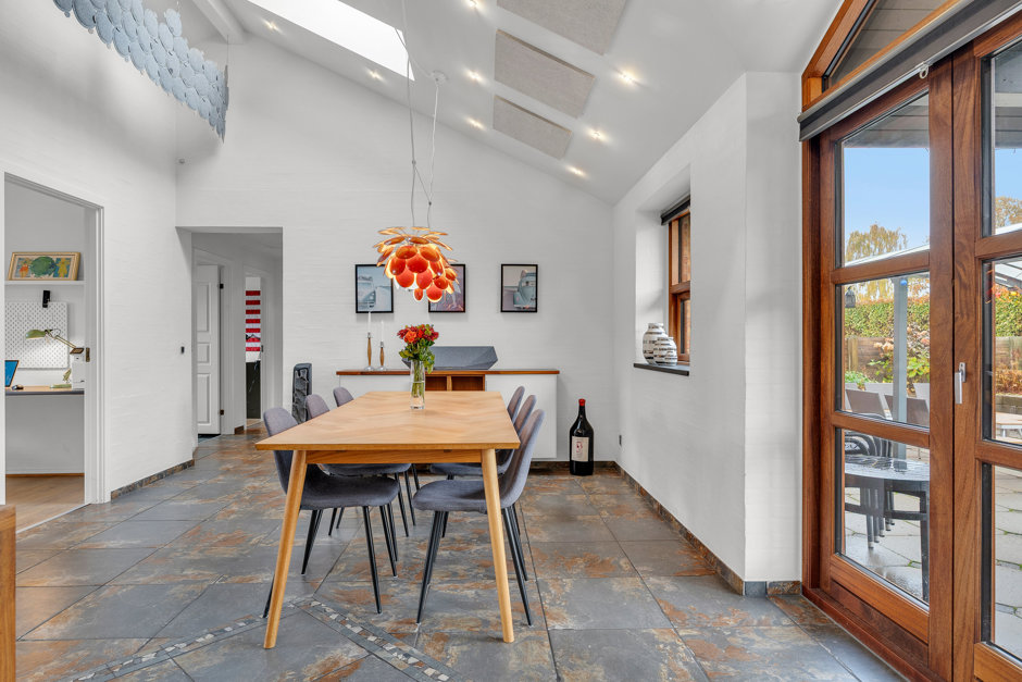 Stor opholdsstue med dobbelt glasdør til alrum samt udgang til terrassen og lysindfald fra alle verdenshjørner.