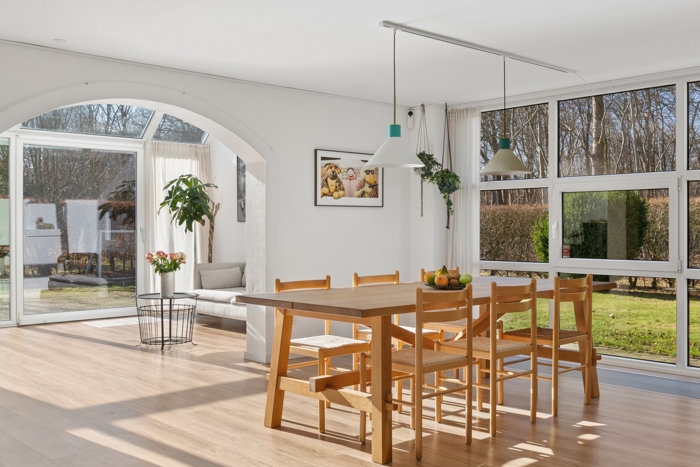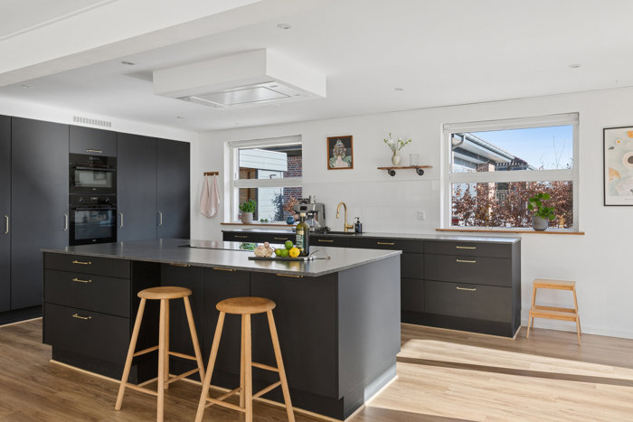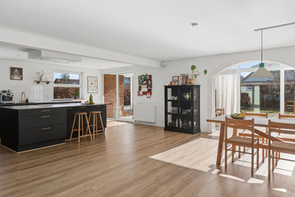 Inde i huset samler livet sig naturligt i det åbne og indbydende køkken-alrum - et rum, der virkelig fungerer som boligens hjerte. Her får du plads, lys og luft. Den store, lækre køkkenø indbyder til både madlavning, gode samtaler og gæster omkring bordet. Køkkenet og løsningerne er desuden topmoderne, og det er tydeligt, at der har været fokus på funktionalitet og æstetik. Vinduespartierne i køkken-alrummet trækker naturen helt ind i rummet og skaber en enestående sammenhæng mellem inde og ude. Dette er altså et køkken-alrum, der både kan rumme hverdagens magiske stunder og de store, festlige sammenkomster.