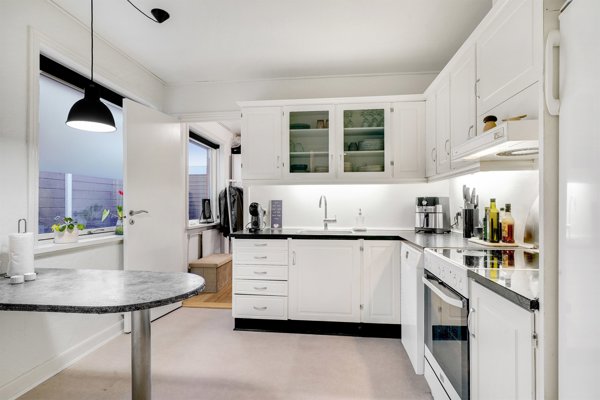 Køkkenet er lyst og funktionelt med god bordplads og skabe, og fra køkkenet er der adgang til et rummeligt bryggers med plads til vaskemaskine og tørretumbler samt ekstra opbevaringsplads. Bryggerset har egen indgang, hvilket gør det oplagt som grovkøkken eller til familiens travle hverdage.