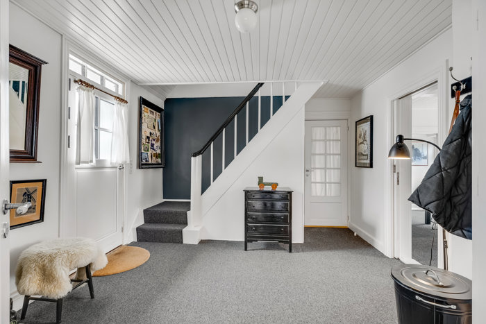 Boligen er indrettet med entré/hall, to charmerende soveværelser, spisestue, rummeligt landkøkken, badeværelse med brusebad samt bryggers. Hertil kommer den store opholdsstue med brændeovn – den tidligere skolestue – som giver huset en helt særlig karakter. I stueplan findes desuden to ekstra indgange, der giver nem adgang til både haven og bryggerset.
