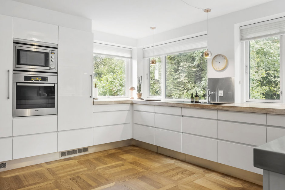 Køkkenet er indrettet med hvide, grebsfrie elementer og har god plads til fælles madlavning. Fra køkkenvasken er der udsigt til havens grønne miljø med shelter og stedsegrønne træer og buske.