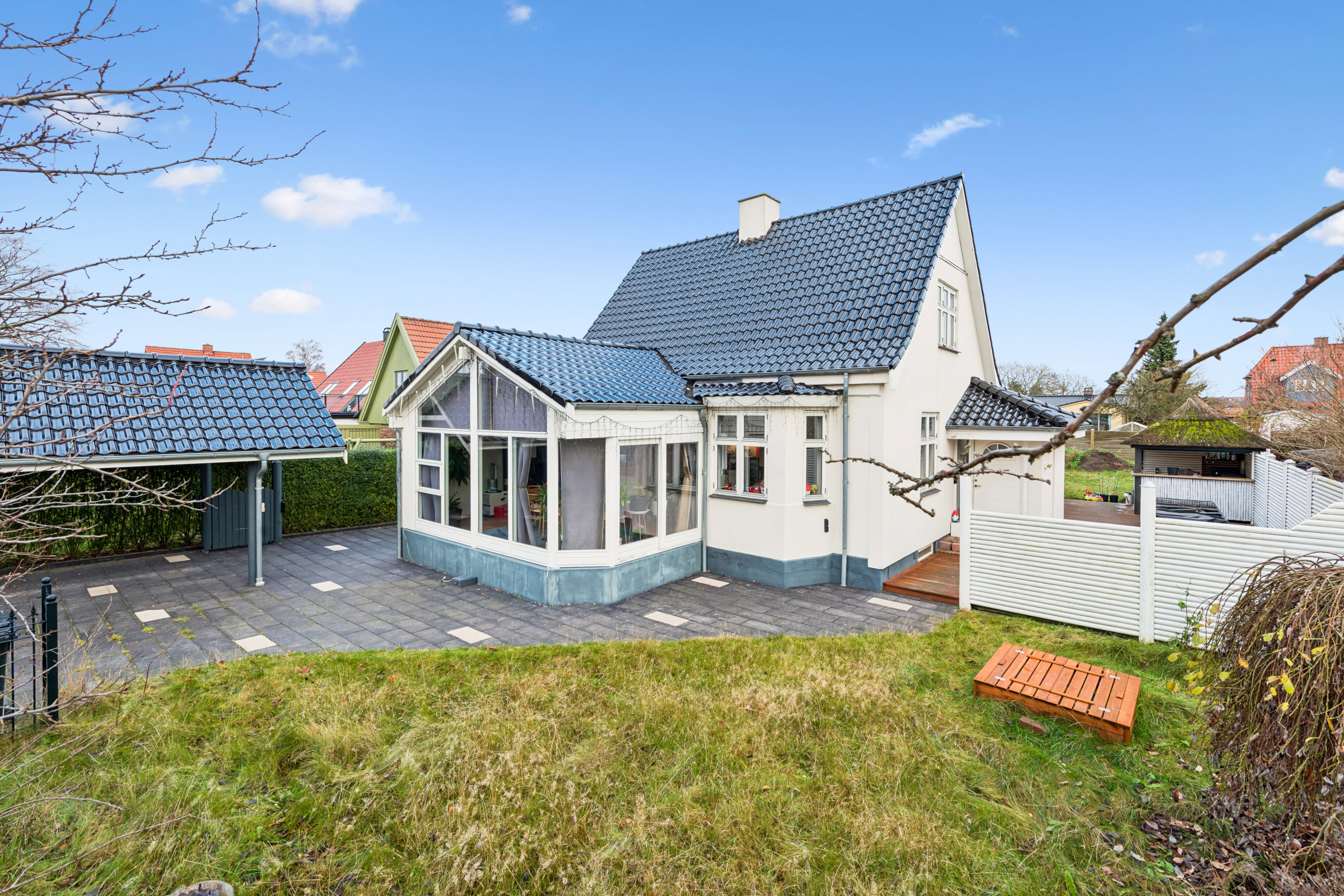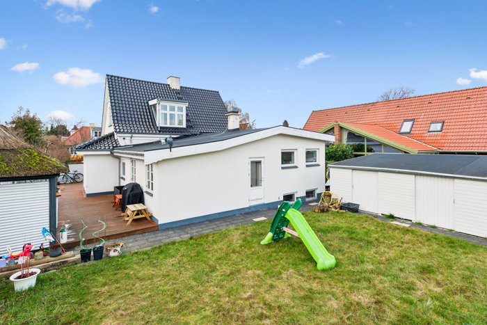 Udefra præsenterer villaen sig pænt med flot tegltag, harmonisk facade, velanlagt flisebelægning og gode parkeringsmuligheder. Rundt om huset ligger en skøn have med flere kroge til leg og afslapning. Den sydvestvendte terrasse er et af husets store aktiver med sol fra middag til aften og en overdækket del, der forlænger sæsonen.
