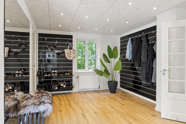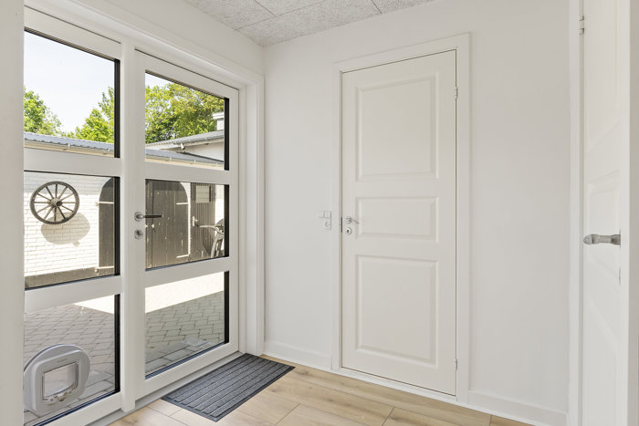 Via den store entre kan du gå direkte ud i det renoverede bryggers, med gulvvarme og en masse god skabsplads er tænkt ind i indretningen.