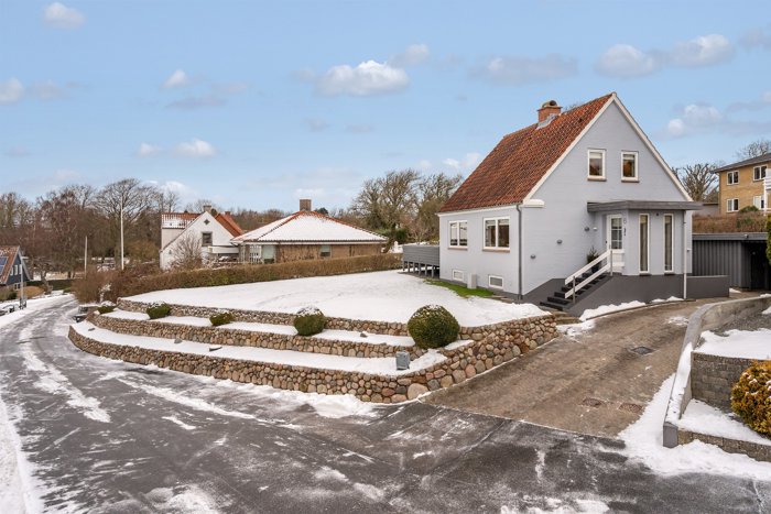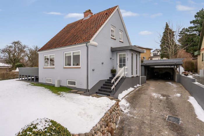 Udenfor parkeres bilen i carporten, og der er tilhørende skur til opbevaring. Haven er nem at holde, og terrassen er prikken over i’et. Herfra er udsigten ganske enkelt fantastisk – især om sommeren, hvor I kan nyde solnedgangen mod vest med kig ud over landskabet og havet i det fjerne.