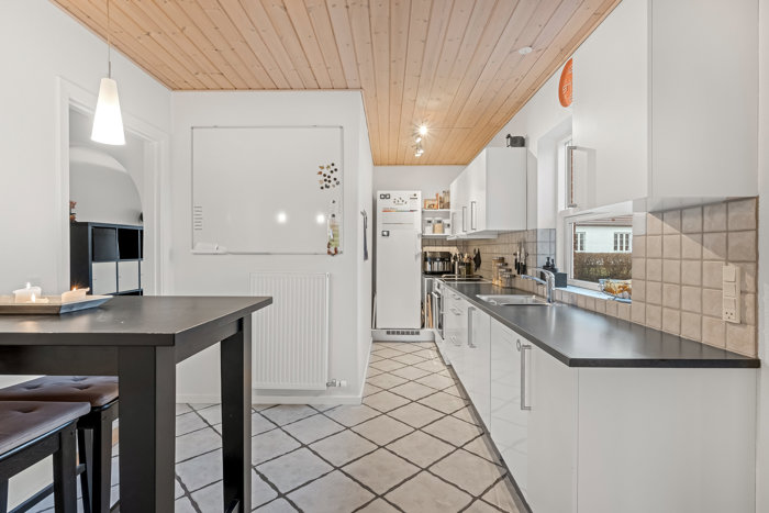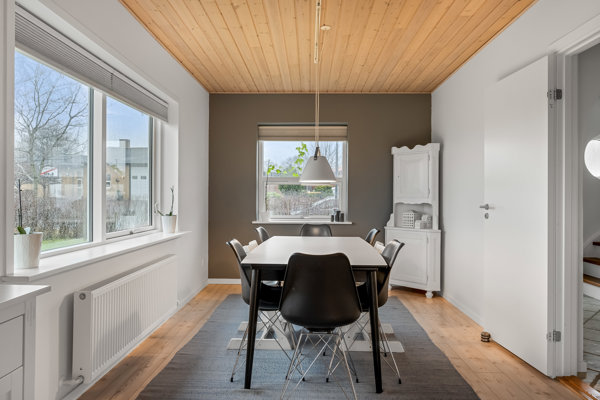 Huset byder på en rummelig stue med et godt lysindfald fra de store vinduer. Her er der plads til både sofaafdeling og spisebord, og brændeovnen er med til at skabe en hyggelig stemning i hverdagen. I forlængelse af stuen ligger køkkenet, som er indrettet med god bordplads og opbevaring. Køkkenet er praktisk indrettet og har plads til en mindre spiseplads.