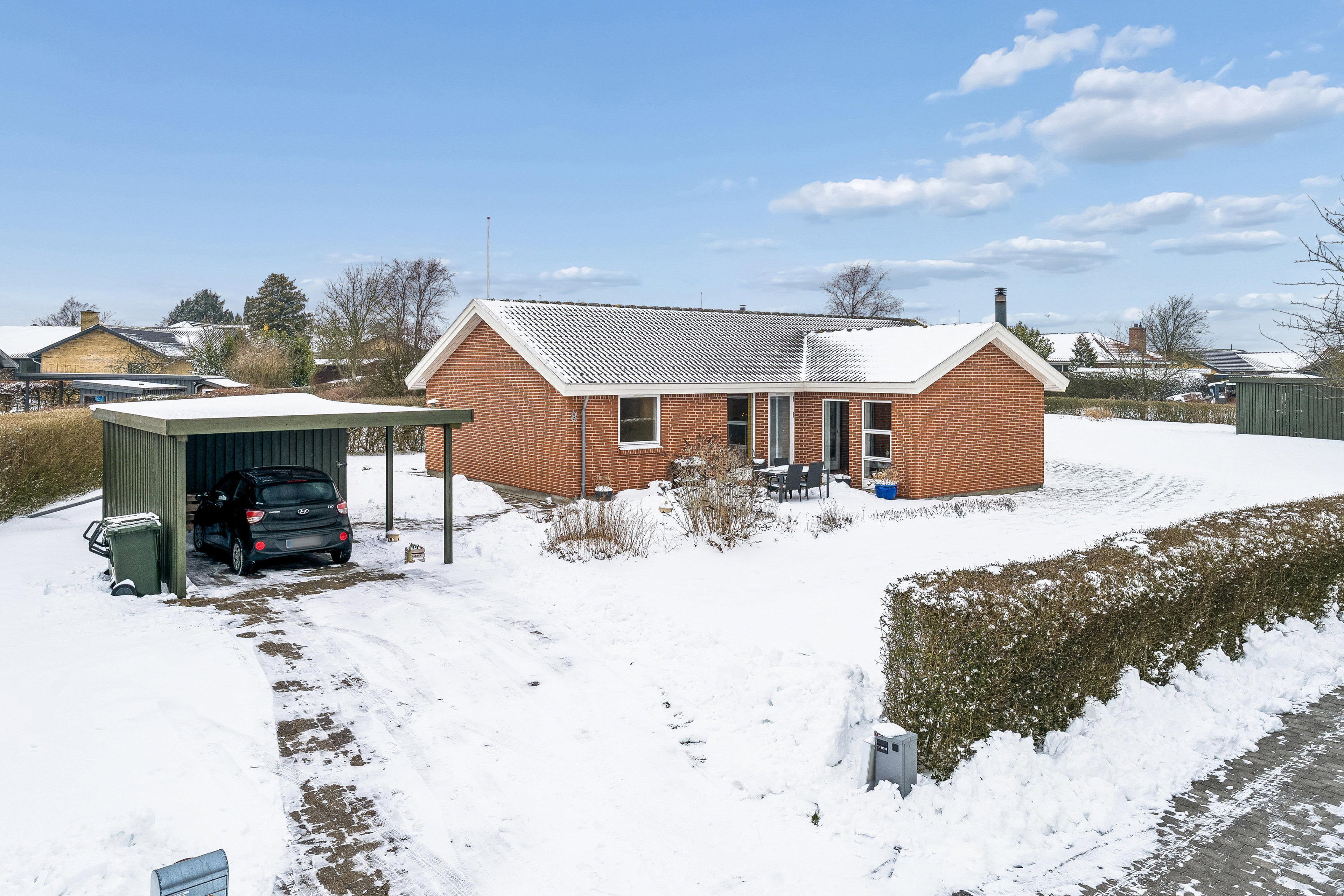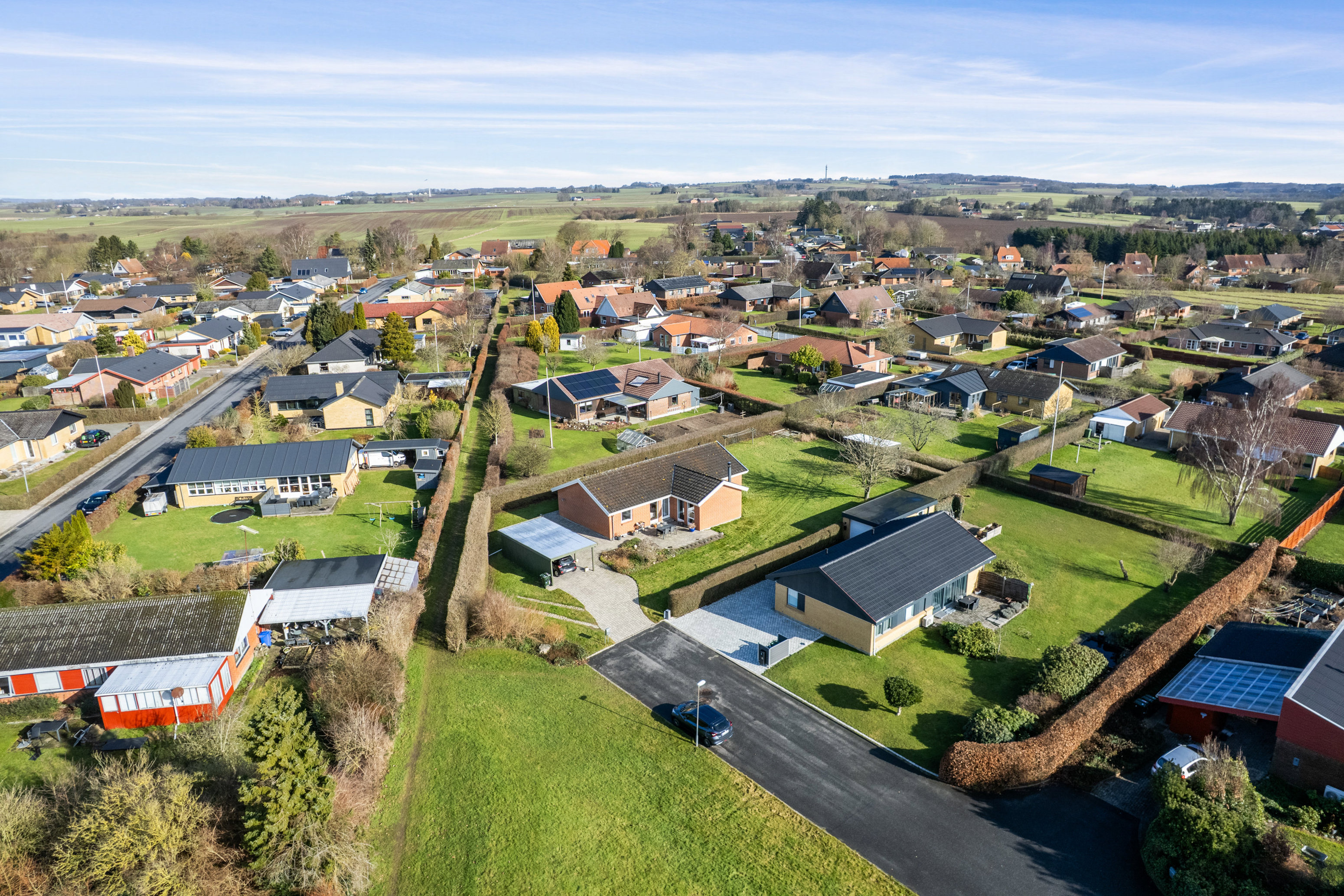 For enden af en lukket vej i et attraktivt kvarter i Barrit finder I denne velholdte og indbydende villa – fredeligt placeret med frit udsyn til grønt område og uden generende gennemkørsel. Her bor I trygt og roligt med en skøn fornemmelse af privatliv på den 1.286 m² store grund, der er omkranset af hæk og anlagt, så den er nem at holde. Haven byder på en stor, plan græsplæne med god plads til leg og boldspil samt frugttræer med både kirsebær og æbler. Den sydvendte terrasse ligger ideelt i forhold til solen og danner en naturlig forlængelse af boligens opholdsrum – perfekt til både hverdagskaffe og lange sommeraftener med familie og venner.
