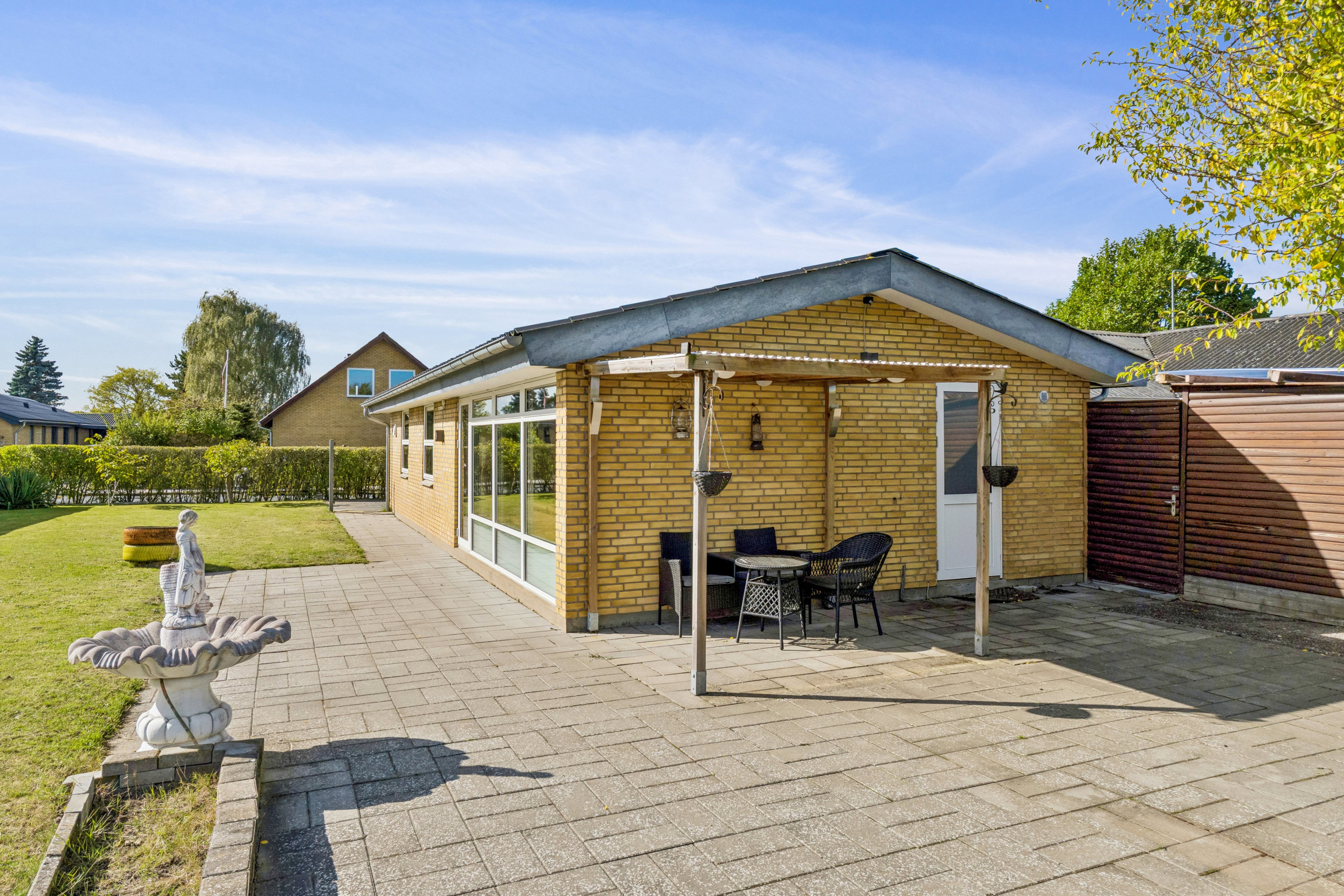Bag huset venter en solrig og nem have samt endnu en fliseterrasse – ideel til sommerens afslapning og hyggelige grillaftener. Hele udearealet er anlagt med tanke på lavt vedligehold.