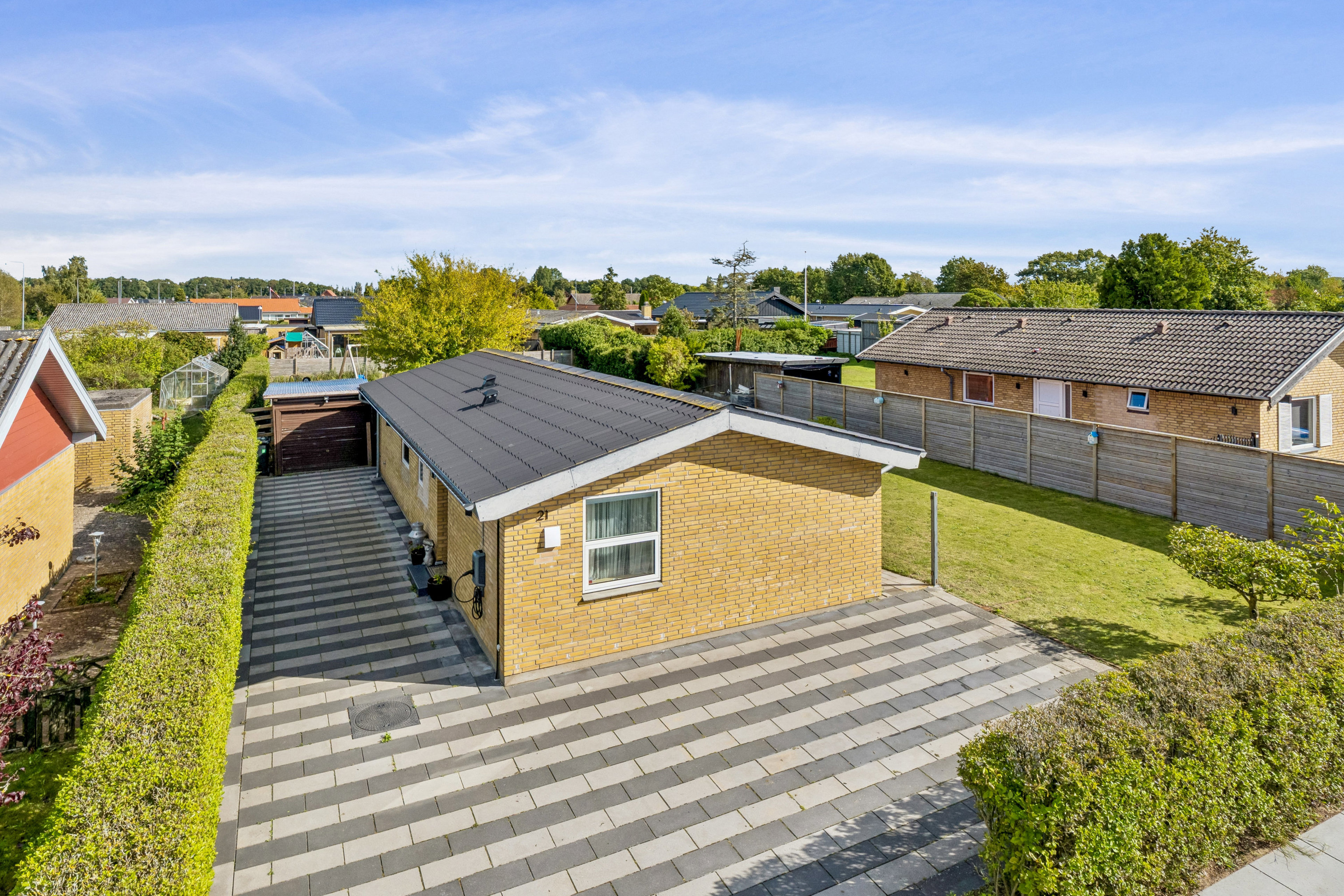 Foran boligen finder du en flisebelagt indkørsel med garage og et praktisk redskabsrum – perfekt til opbevaring af haveredskaber eller cykler.