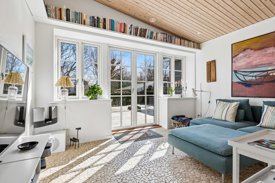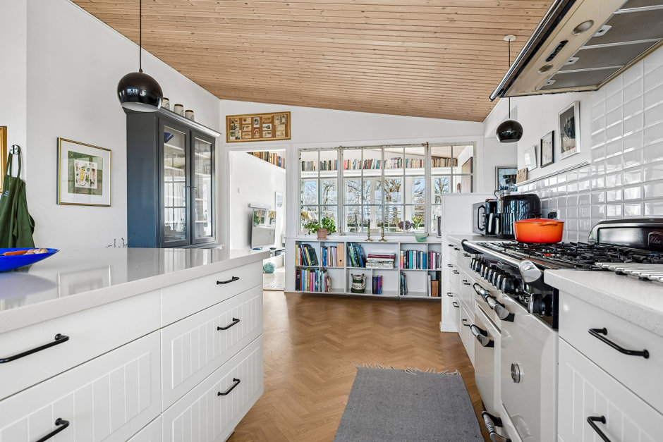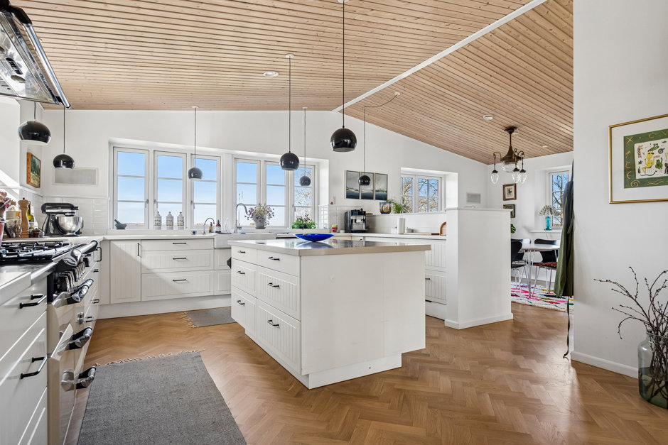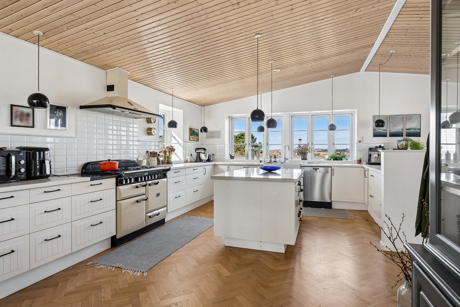 Husets hjerte er det imponerende køkken-alrum med smukke sildebensgulve og store vinduespartier, der inviterer naturen helt indenfor og igen præsenterer den storslåede udsigt. Herfra er der forbindelse til både tv-stue og opholdsstue, som tilsammen skaber gode og fleksible opholdsrum for hele familien.
