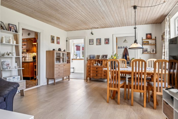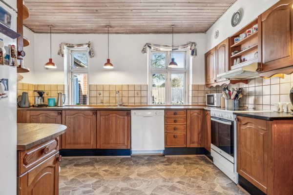 Villaen byder velkommen i en lys og indbydende forgang, der leder videre til husets øvrige rum. Den store stue er lys og luftig, og de store vinduer giver et fantastisk lysindfald, hvilket skaber et behageligt og åbent opholdsområde. Fra stuen er der adgang til køkkenet, som er funktionelt indrettet og tilbyder god opbevaringsplads samt mulighed for at skabe et åbent og hyggeligt samlingspunkt i hjemmet.
