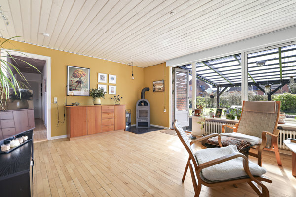 Boligen fremstår utrolig veludnyttet og indeholder en entré med skabsplads, et hyggeligt køkken i delvis åben forbindelse med den lyse vinkelstue med brændeovn. Fra stuen er der udgang til en skøn, delvist overdækket terrasse, som danner en hyggelig oase i sommerhalvåret. Planløsningen rummer to store værelser, hvoraf det ene tidligere har været opdelt i to værelser – en løsning der nemt kan genskabes (se plantegning). Hertil kommer et ældre, men pænt badeværelse med badekar samt i tilbygningen et stort soveværelse med tilhørende lækkert og rummeligt badeværelse samt et meget stort bryggers med god opbevaringsplads, vaskesøjle og skabe. Boligen fremstår gennemgående lys med et dejligt lysindfald og en helt særlig hyggelig atmosfære.