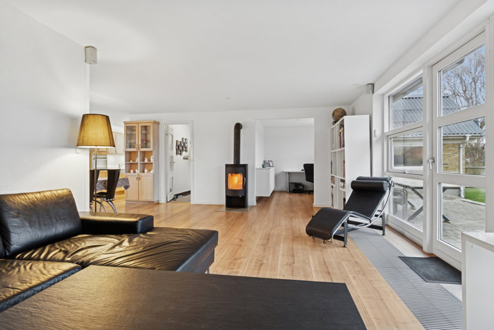 Boligen byder på et indbydende stueplan, hvor husets naturlige samlingspunkt er det store køkken/alrum i åben forbindelse med stuen. Her strømmer lyset ind, og indretningen giver god plads til både hverdagens måltider og hyggelige sammenkomster. Flere af køkkenets hårde hvidevarer er udskiftet i løbet af det seneste år, og den store opholdsstue fremstår indbydende med nyere brændeovn, som bidrager med både varme og stemning.