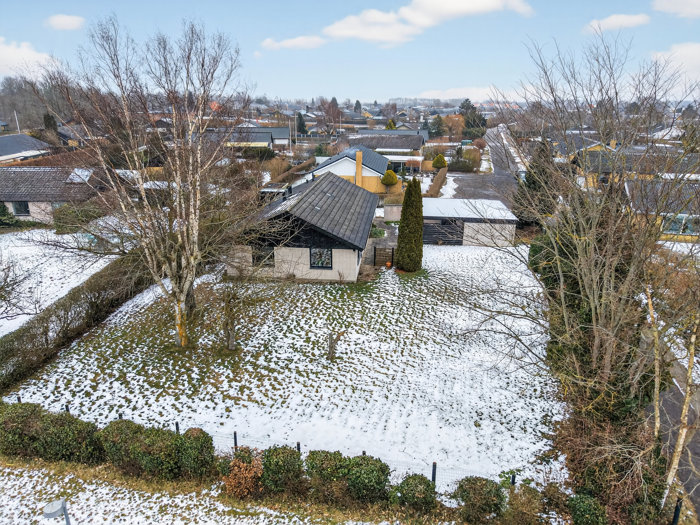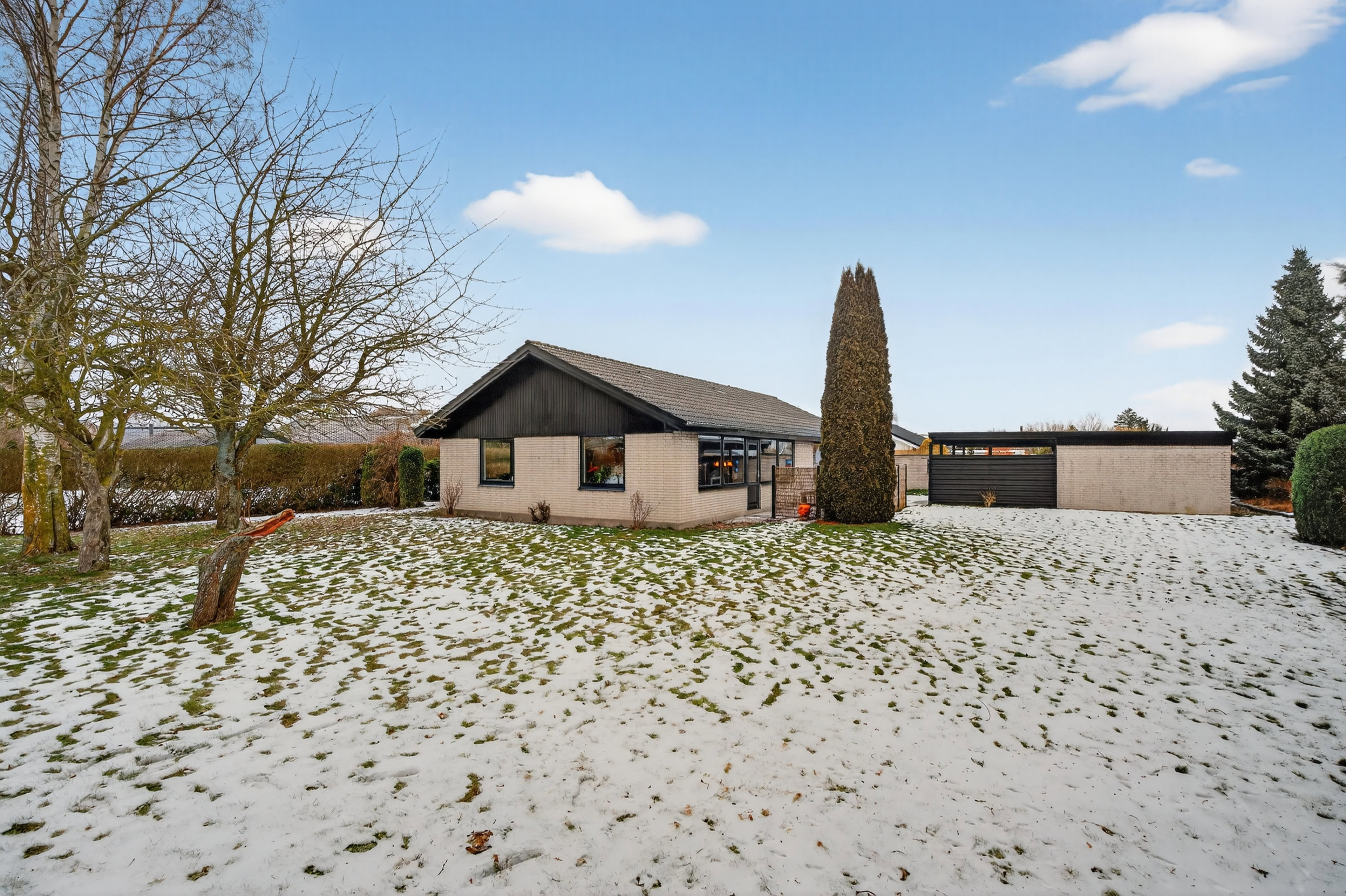 I finder villaen på en 1.074 m2 stor grund, hvor huset ligger behageligt tilbagetrukket fra vejen. Haven er sydvestvendt, og de hvide mursten på husets facader er ligeledes brugt i læmuren, som indrammer det meste af solgården. Her har man ganske snedigt ført taget fra carporten over henover, så også en del af det store, private terrassemiljø er overdækket. På modsatte side af hækken finder I desuden stien til kvarterets gode legeplads, som ligger under 100 meter væk.