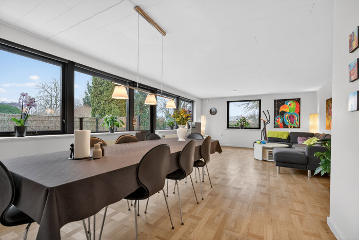 Man har taget løbende hånd om opdateringer og vedligehold, men omvendt finder I fortsat nogle velvalgte originale detaljer i villaen fra 1971. Heldigvis har man bevaret de mønstrede parketgulve, som sætter stemningen i langt de fleste rum, og senest er huset koblet på fjernvarmen i 2026.