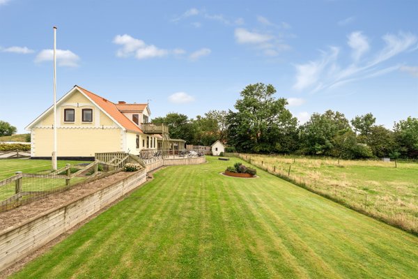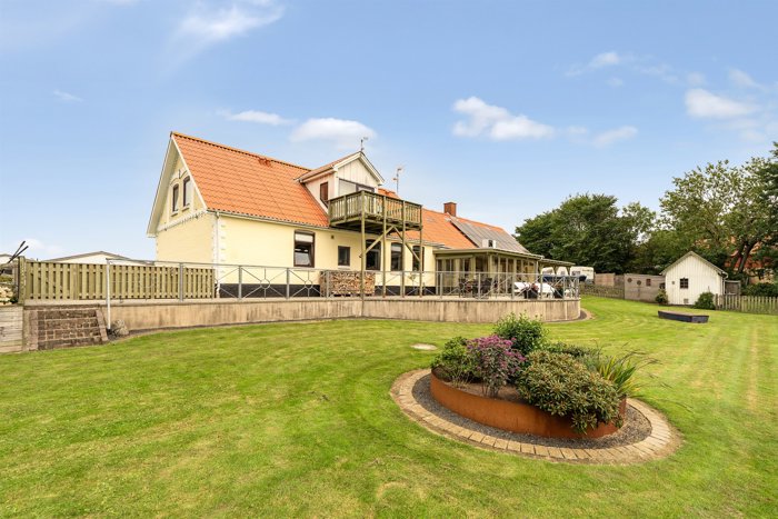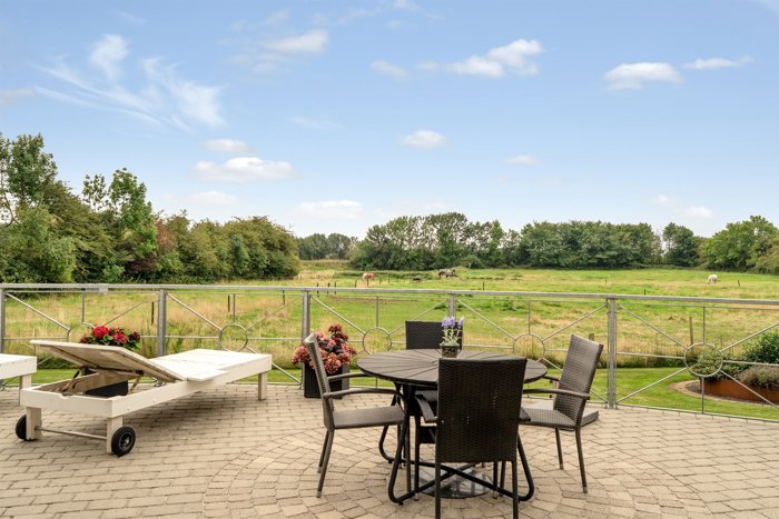 Ude får du glæde af en stor grund på 1.483 m² med god afstand til naboerne. Der er hele fire sydvendte terrasser samt en altan, så der er rig mulighed for at nyde solen og udsigten over de grønne omgivelser.