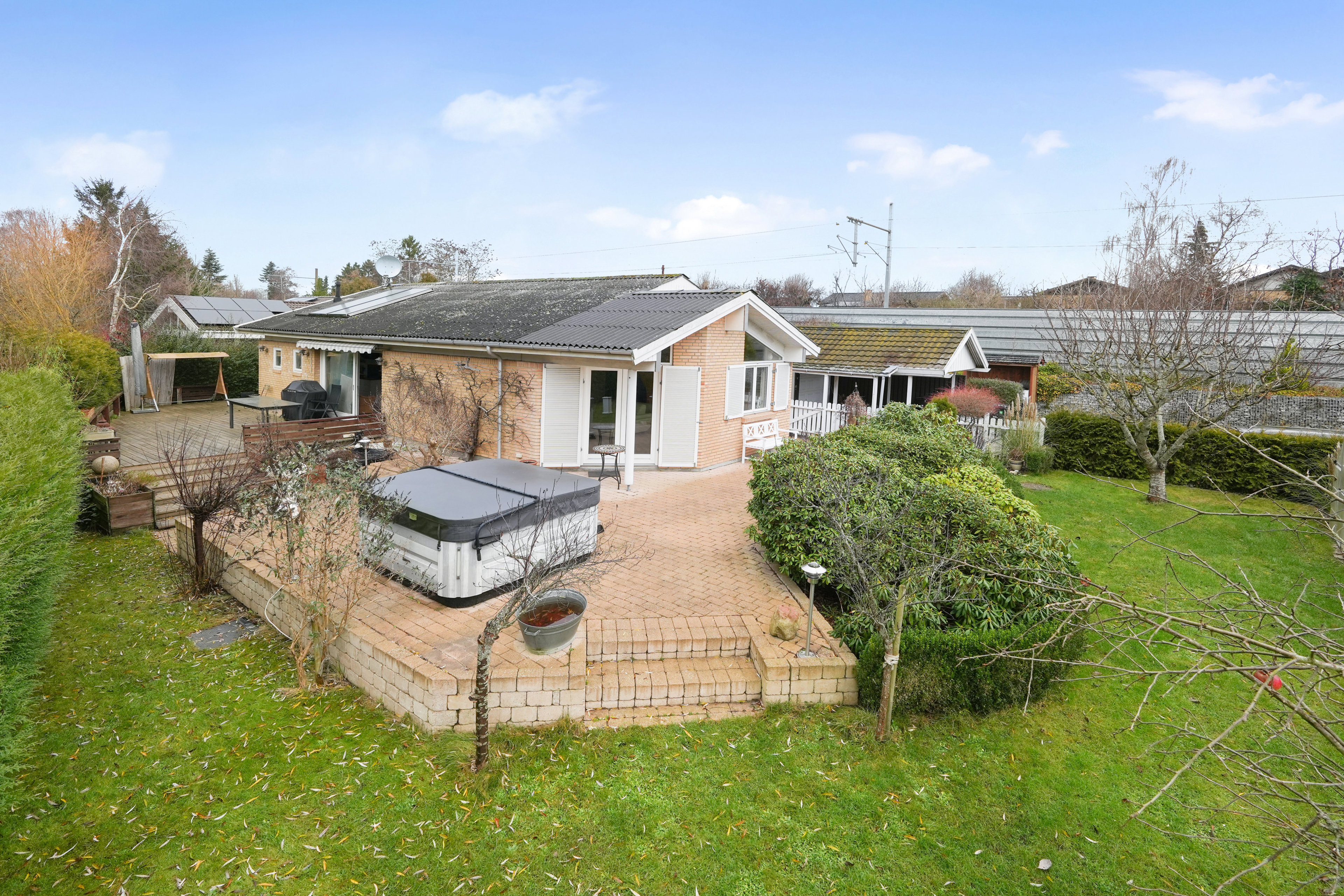 Det er nærliggende at tro, at man har lagt alle kræfter i selve huset. Men det er ikke tilfældet. Også den dejlige have har meget at sige, for I kan glæde jer til lækre terrasser både mod syd, øst og mod vest. Træterrassen med markise er måske den bedste, men glem heller ikke den store fliseterrasse og den lille, overdækkede sektion med udgang fra stuen. Derudover er selve haven perfekt anlagt med drivhus, frugttræer samt velplejede buske og bede.