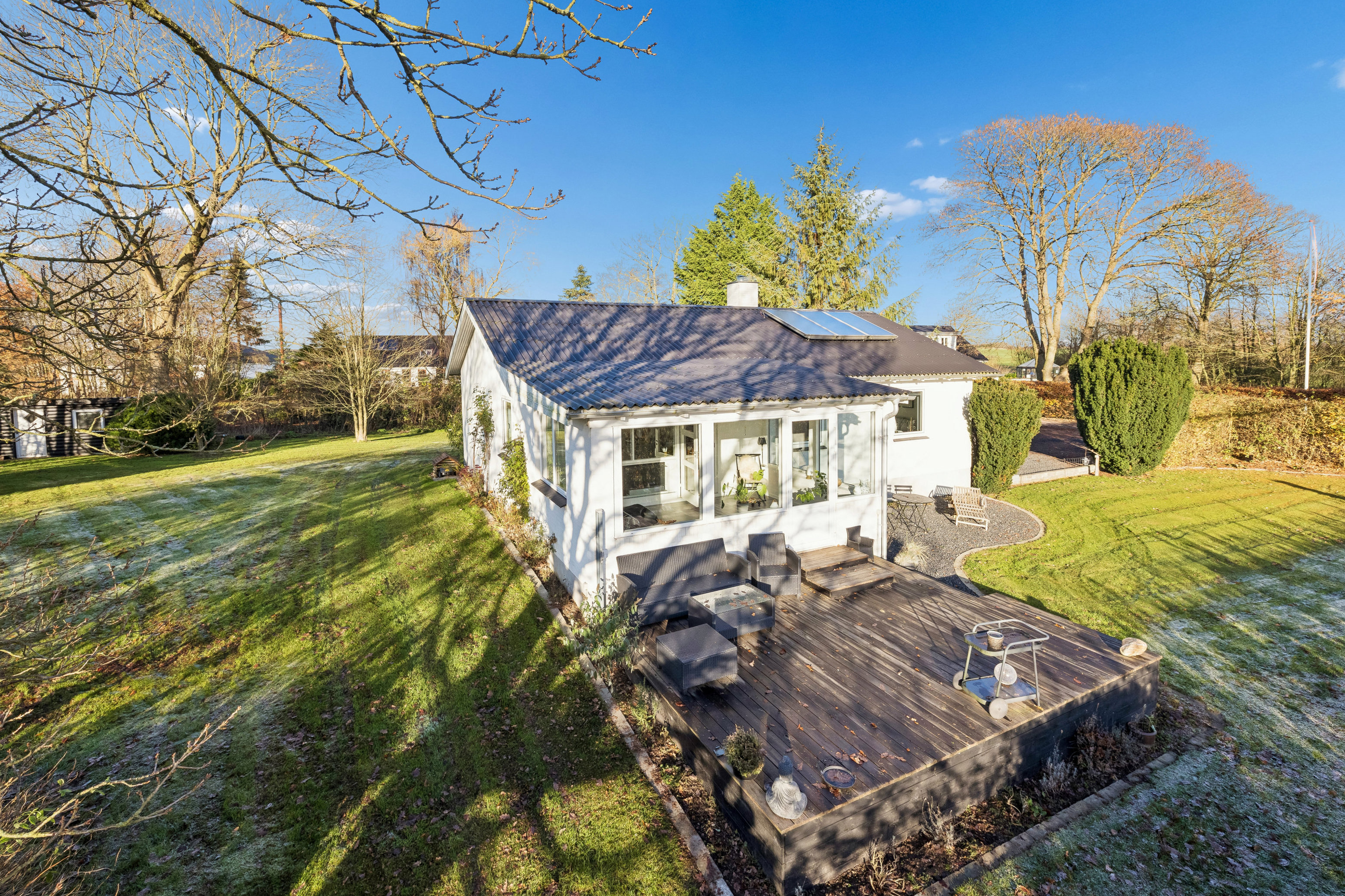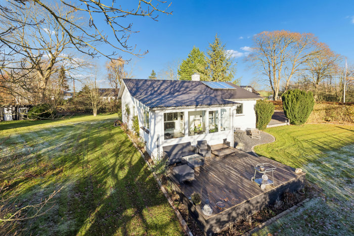 Grunden strækker sig over hele 2.035 m², så der er rigeligt med plads til både leg, haveprojekter og ren afslapning. Haven fungerer som et fredfyldt fristed, hvor du kan nyde udsigten over det grønne landskab og finde ro i hverdagen.