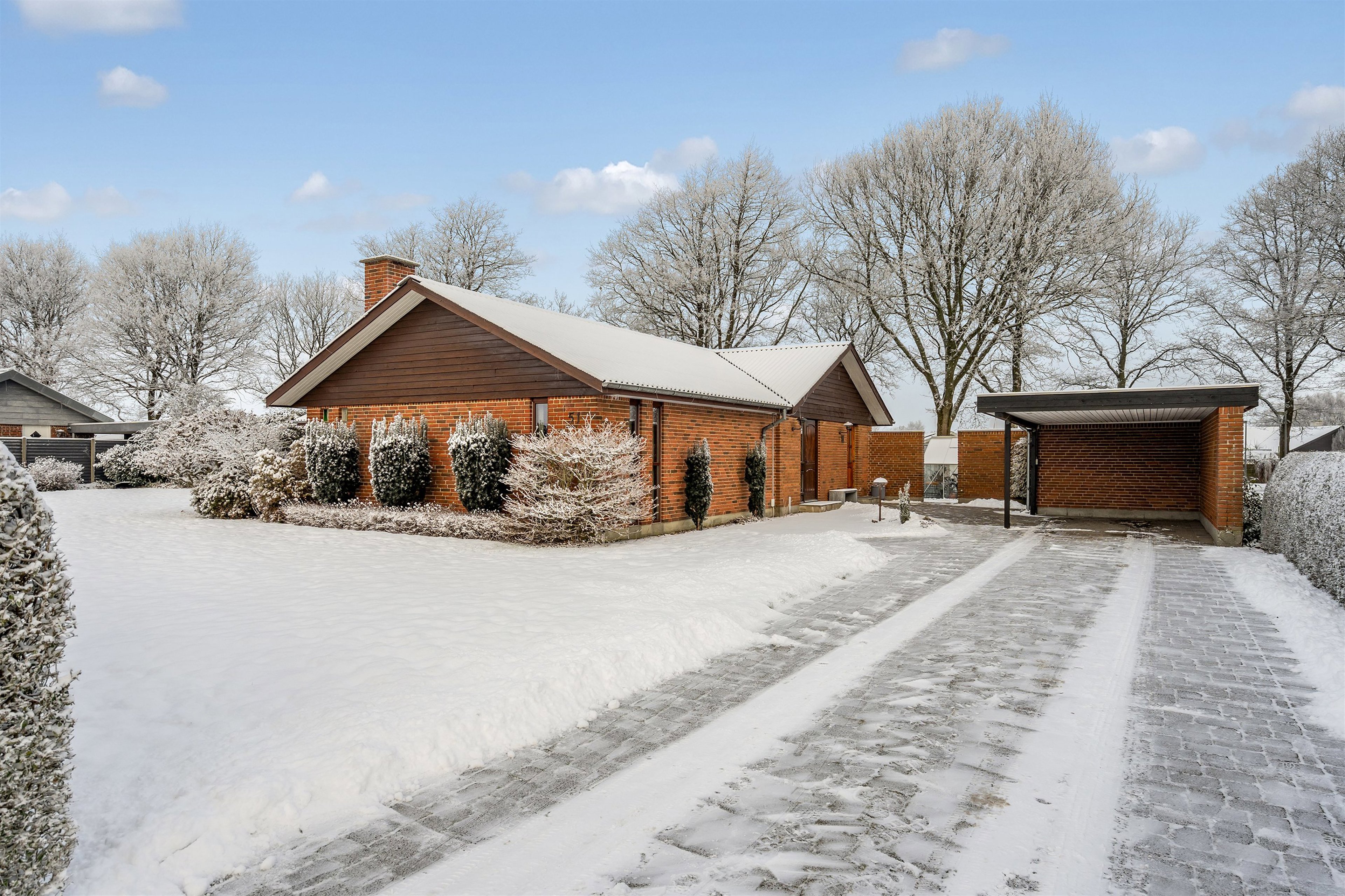 Boligen rummer 154 m² bolig og suppleres af en 33 m² carport med integreret værksted samt et regulært udhus på 31 m², der giver fremragende opbevarings- og hobbyfaciliteter.
