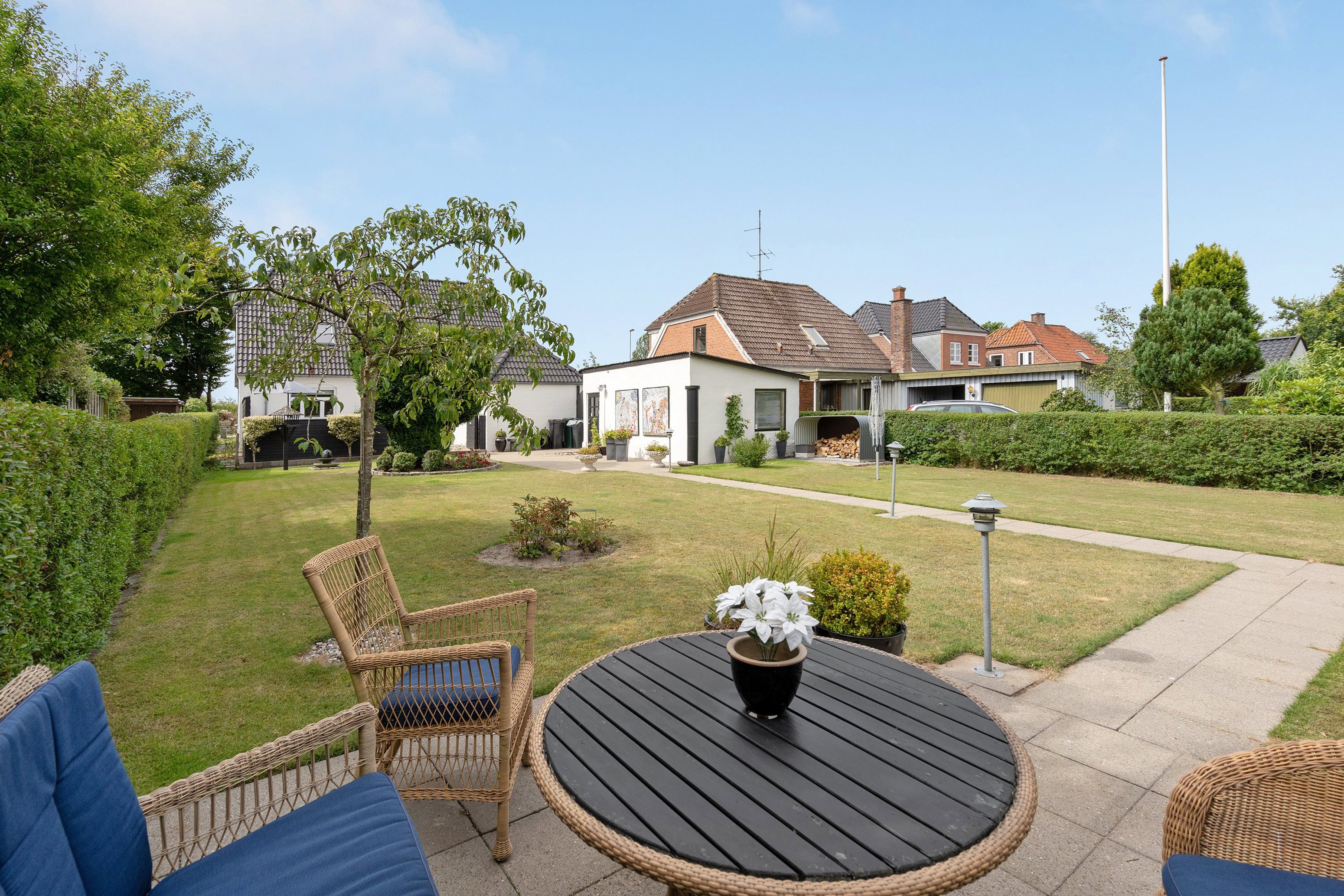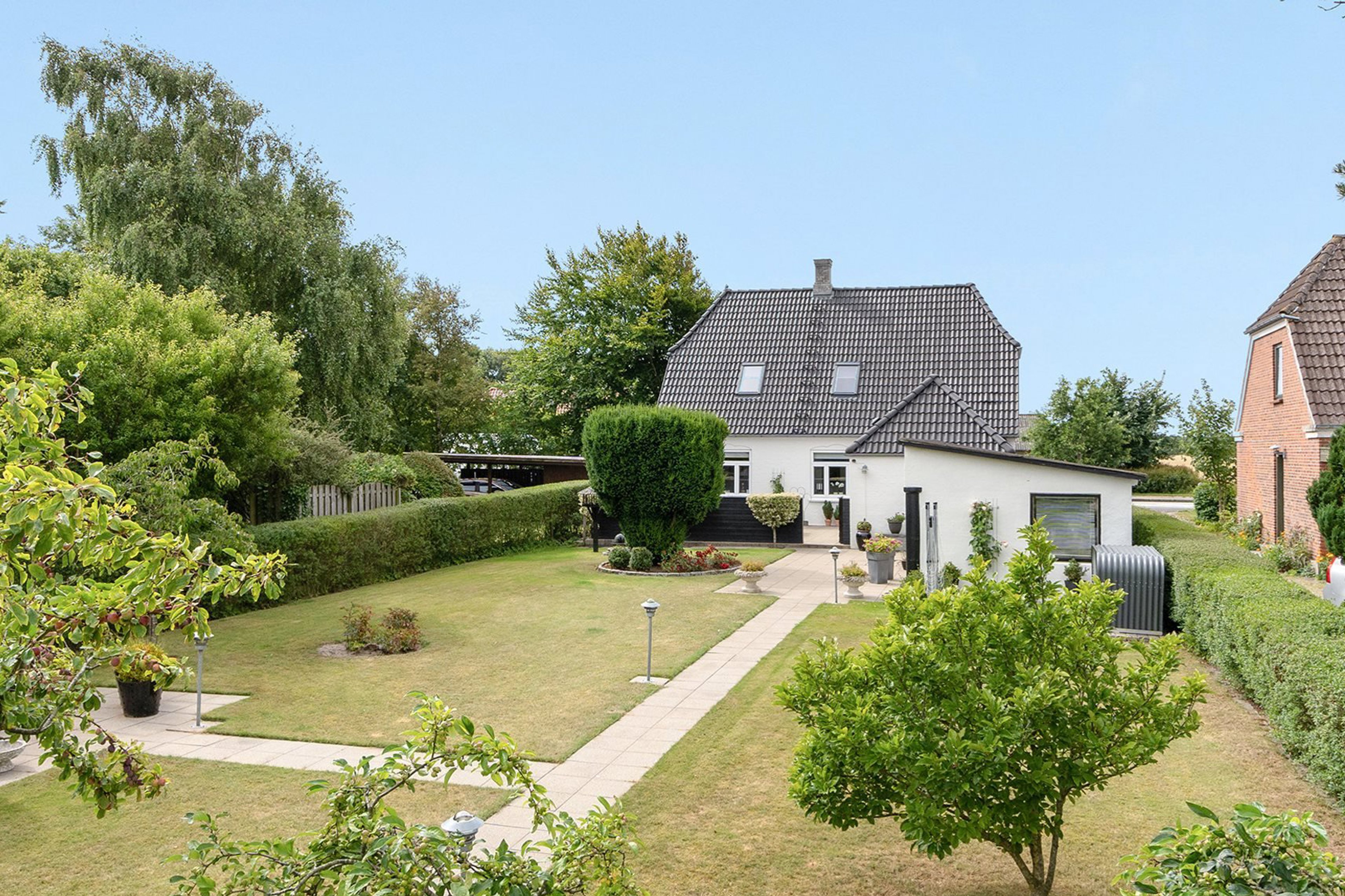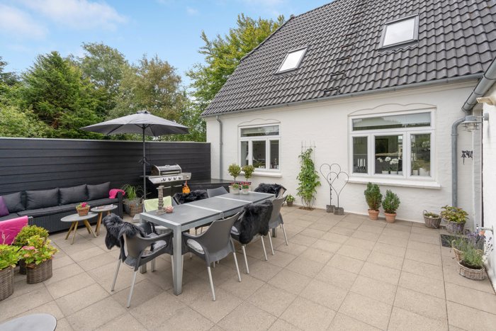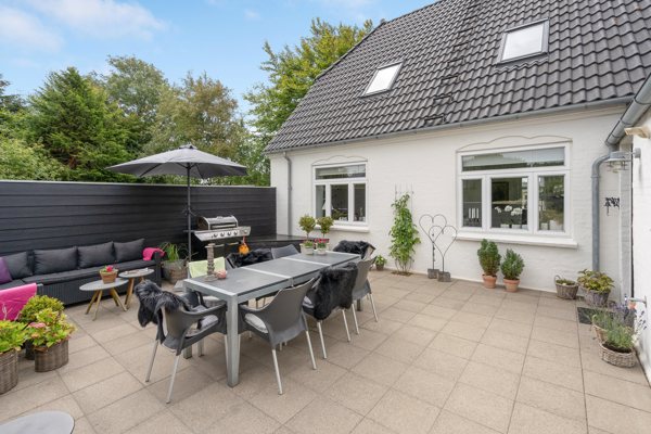 Udenfor venter en frodig og velanlagt have, som er en sand oase. Her er flere solrige terrasser og hyggelige kroge, hvor du kan nyde udendørslivet i fulde drag. Den gårdhave-lignende terrasse ved huset er oplagt til afslappende stunder, mens fliseterrassen i bunden af haven inviterer til rolige eftermiddage. Haven byder desuden på et praktisk udhus og en dobbelt carport med tilhørende redskabsrum.