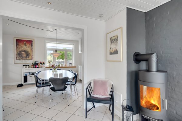 Med sine rummelige 182 m² er villaen optimalt indrettet til familien, der sætter pris på både funktionalitet og æstetik. Boligens stueplan byder på et lyst og funktionelt bryggers med loft til kip og praktisk klinkegulv. Badeværelset er stilfuldt indrettet med loft til kip, stor bruseniche og dobbelte vaske med rigelig opbevaringsplads. Den indbydende entré med trappeløb leder dig videre til husets hjerte – en hyggelig spisestue, der ligger i åben forbindelse med køkken-alrummet. Her finder du et flot, lyst køkken med god arbejdsplads og en stemningsfuld brændeovn, perfekt til familiens samvær. Gennem franske dobbeltdøre kommer du til den hyggelige tv-stue, hvor det smukke egetræsgulv skaber varme og atmosfære. Stueplan rummer desuden et ekstra værelse, der giver mulighed for at skabe en separat forældre- eller børneafdeling. Hele etagen er udstyret med gulvvarme, og lydisolerede vinduer mod vejen sikrer et roligt indeklima.