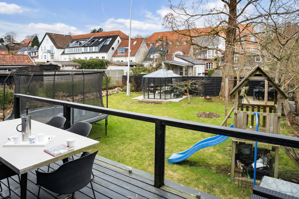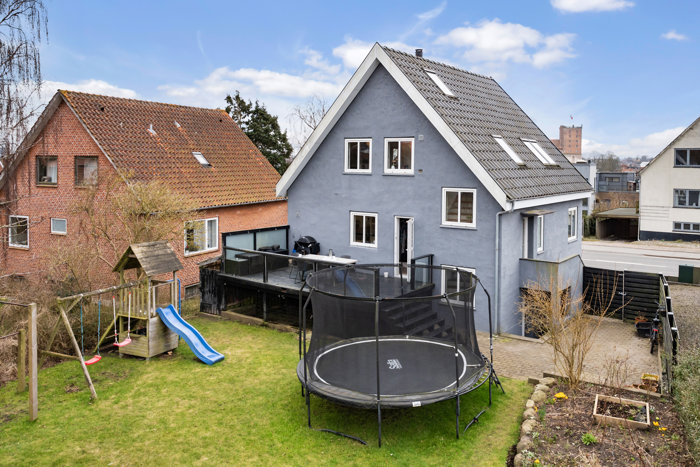 Udendørs venter en dejlig, lukket have med god plads til både leg og afslapning. Her er trampolin, legehus og grønne områder, som indbyder til udeliv for både børn og voksne. Den hævede terrasse fungerer som et skønt opholdssted, hvor I kan nyde solen og udsigten over haven.