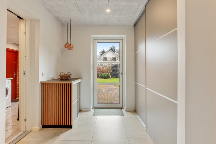 Du bydes velkommen i en praktisk og moderniseret entré med store, elegante klinker og varme træpaneler på væggene, der straks giver et eksklusivt og hjemligt førstehåndsindtryk. I forlængelse heraf finder du et funktionelt bryggers med god opbevaringsplads. Fordelingsgangen giver dig herefter adgang til et charmerende køkken fyldt med sjæl, atmosfære og skønne rammer for hverdagens samvær. I stueplan findes desuden et praktisk og velindrettet toilet og badefaciliteter.