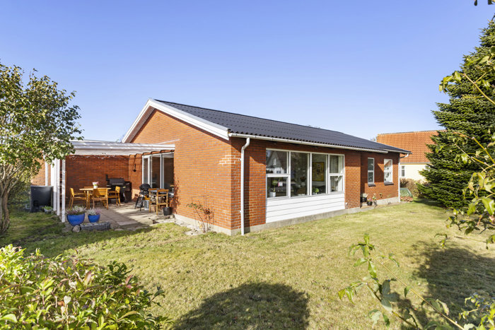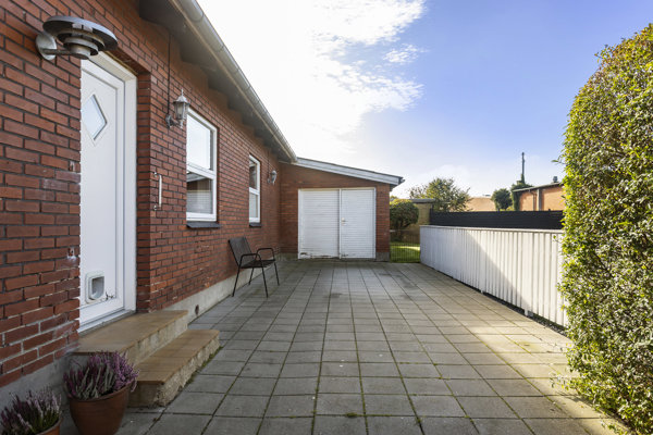 Udenfor venter en dejlig have, som omkranser huset og indbyder til både leg og afslapning. De gamle træer og den varierede beplantning skaber en hyggelig stemning, mens den store plæne giver rig mulighed for boldspil eller små haverum med blomster og urter. Den lange flisebelagte indkørsel leder frem til den murede garage, som i dag bruges som udhus, og her er der plads til både cykler, haveredskaber og opbevaring.