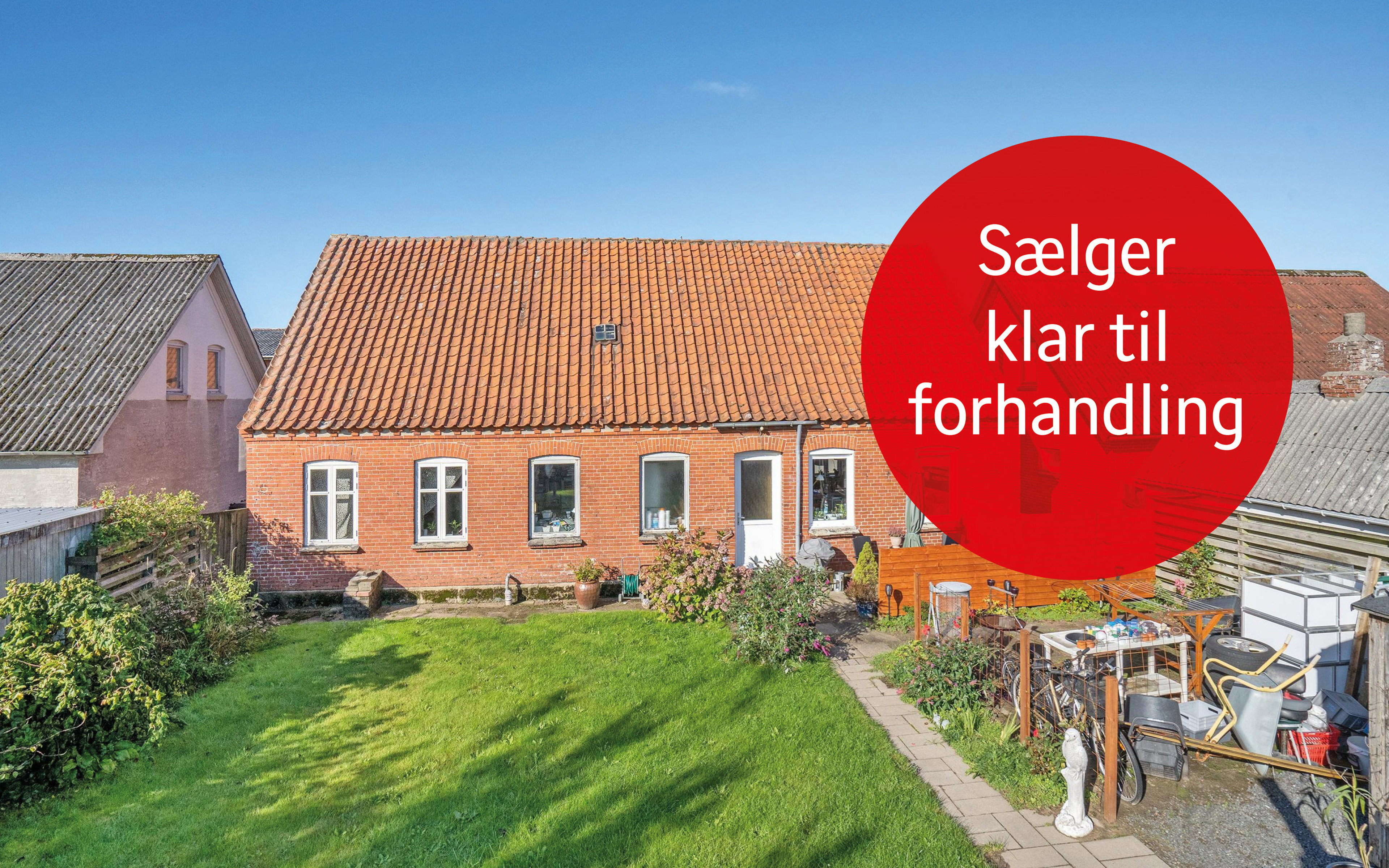 Villaen er muret i røde sten og har indhegnet rummelig have, hvor der er gode mulighed for at lege, slappe af og hygge sig i ugenerede rammer.
