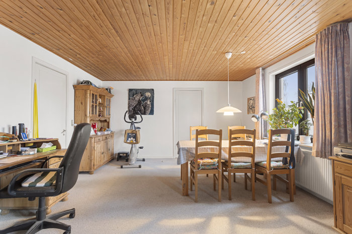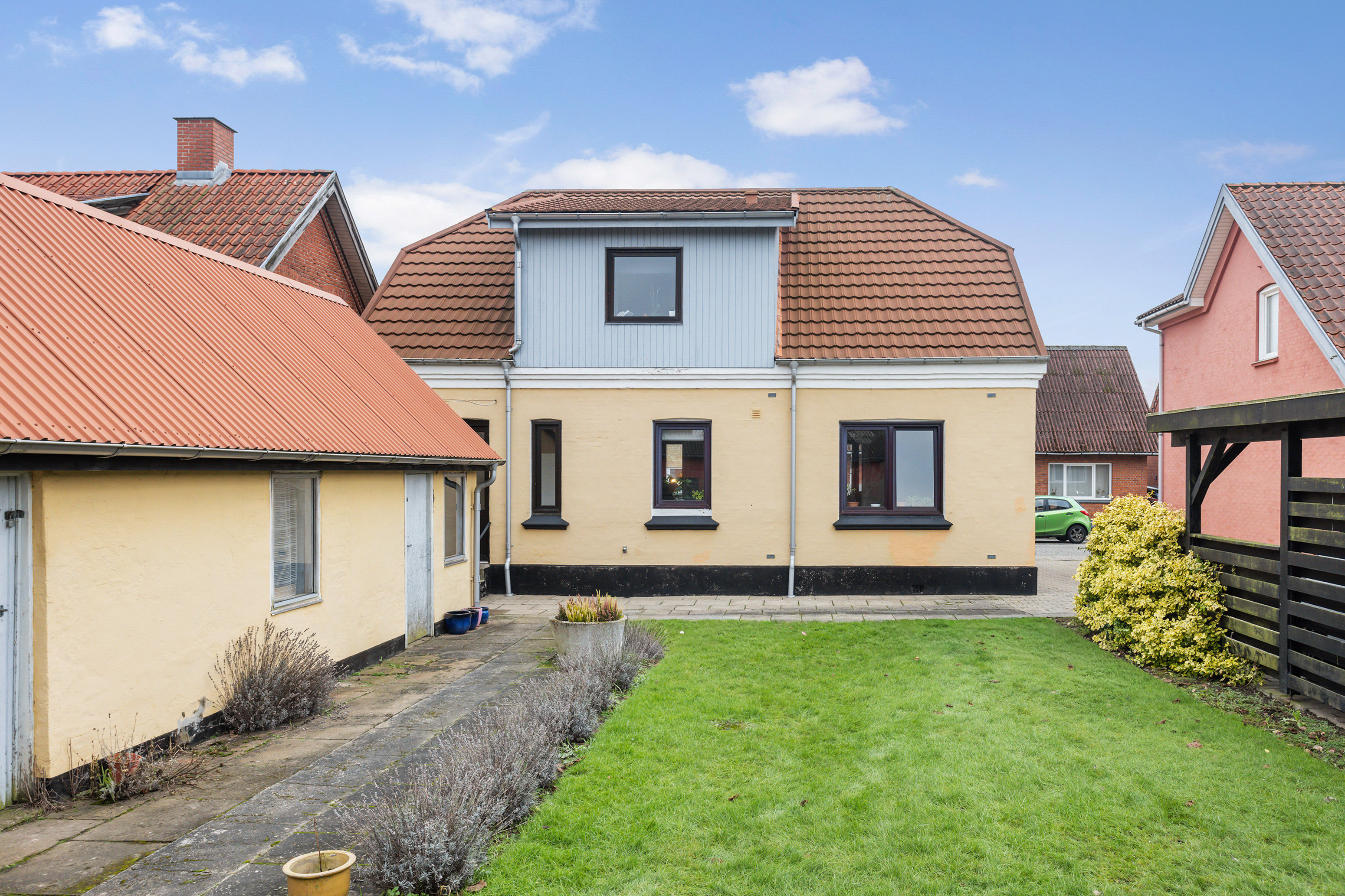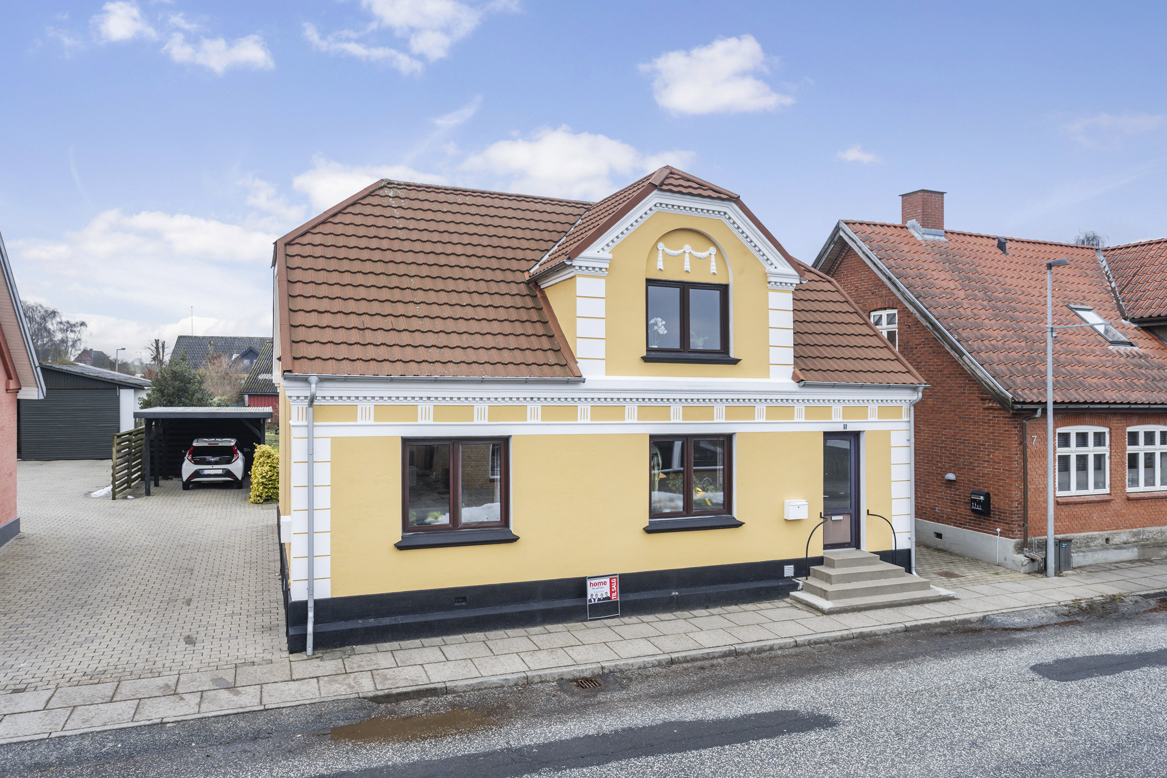 På Nørregade 5 i Hørby mødes man af en fin og indbydende ejendom, der med sin pudsede, gulmalede facade og fine hvide friser fremstår klassisk og velholdt. Det røde, tegllignende Decra-tag giver huset et solidt og harmonisk udtryk, som passer naturligt ind i gadebilledet, mens de vedligeholdelsesvenlige vinduer understøtter den praktiske hverdag. Her er tale om en ejendom med karakter, men også med en indretning, der åbner for flere anvendelsesmuligheder.