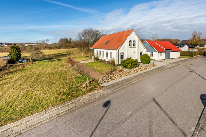 Derudover får du en selvstændig bygning med garage, værksted og kontor, som giver plads til både hobbyer og praktiske behov. På førstesalen finder du tre værelser, hvoraf det primære har adgang til en vestvendt altan med aftensol. Et gæstetoilet fuldender etagen og skaber en god fordeling mellem opholdsrum og private områder. Ved at flytte døren i værelset der ligger ved siden af soveværelset, kan man nemt lave et separat værelse.