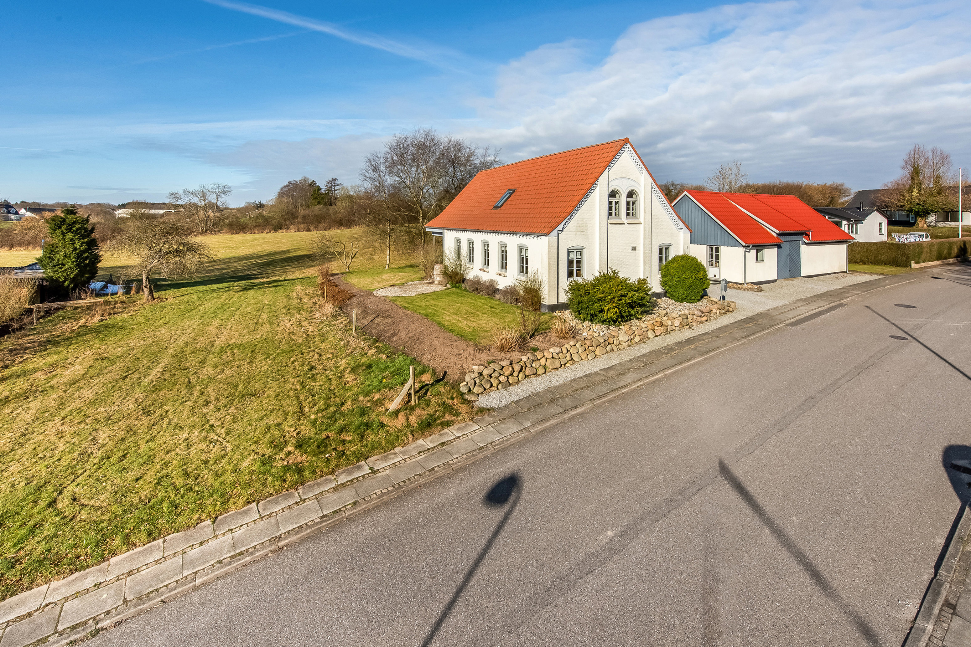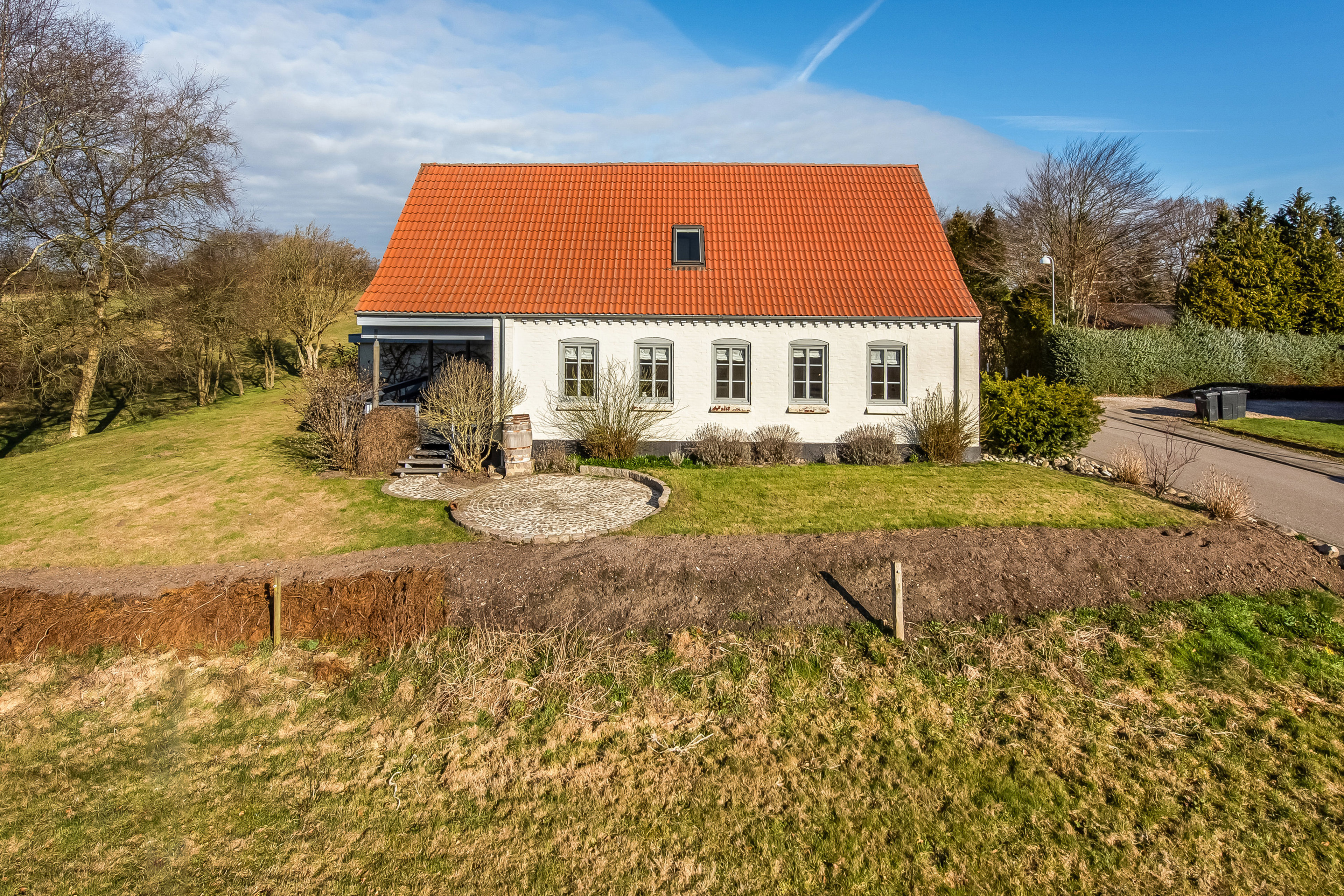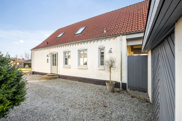 Udenfor fortsætter den fredelige stemning på en grund med udsigt til åbne marker. Den sydvendte terrasse inviterer til lange sommeraftener, mens den østvendte terrasse giver plads til rolige morgener i det fri. Her får du følelsen af at være tæt på naturen, uden at give afkald på hverdagens bekvemmeligheder.