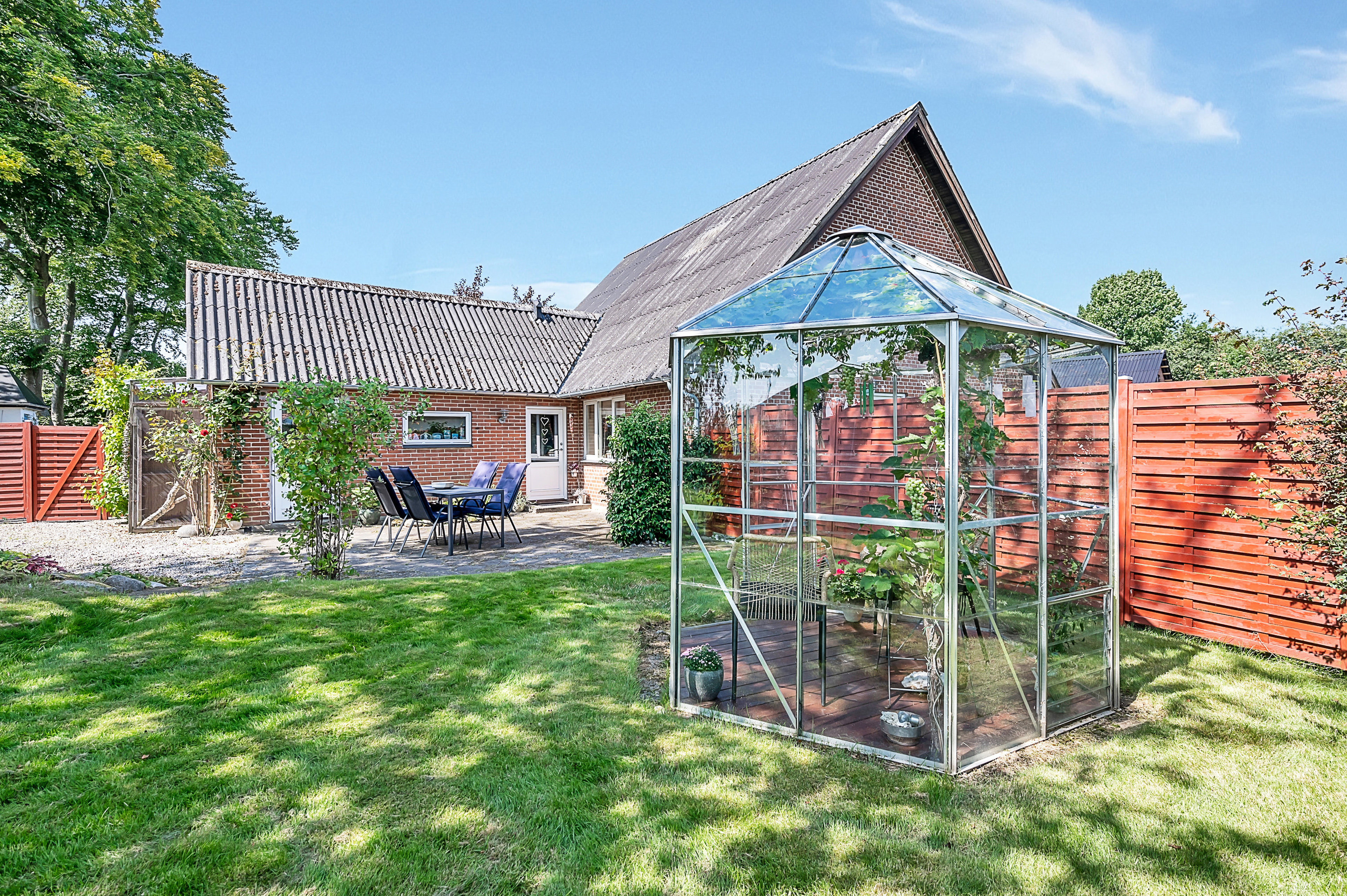Sydvendt have med drivhus og terrasser