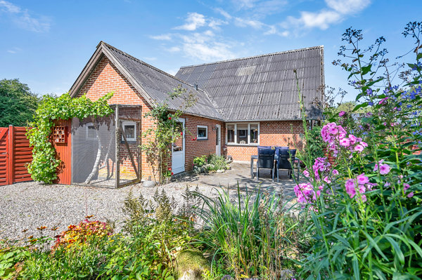 Gedigent rødstenshus med stor sydvendt have og udsigt over marker