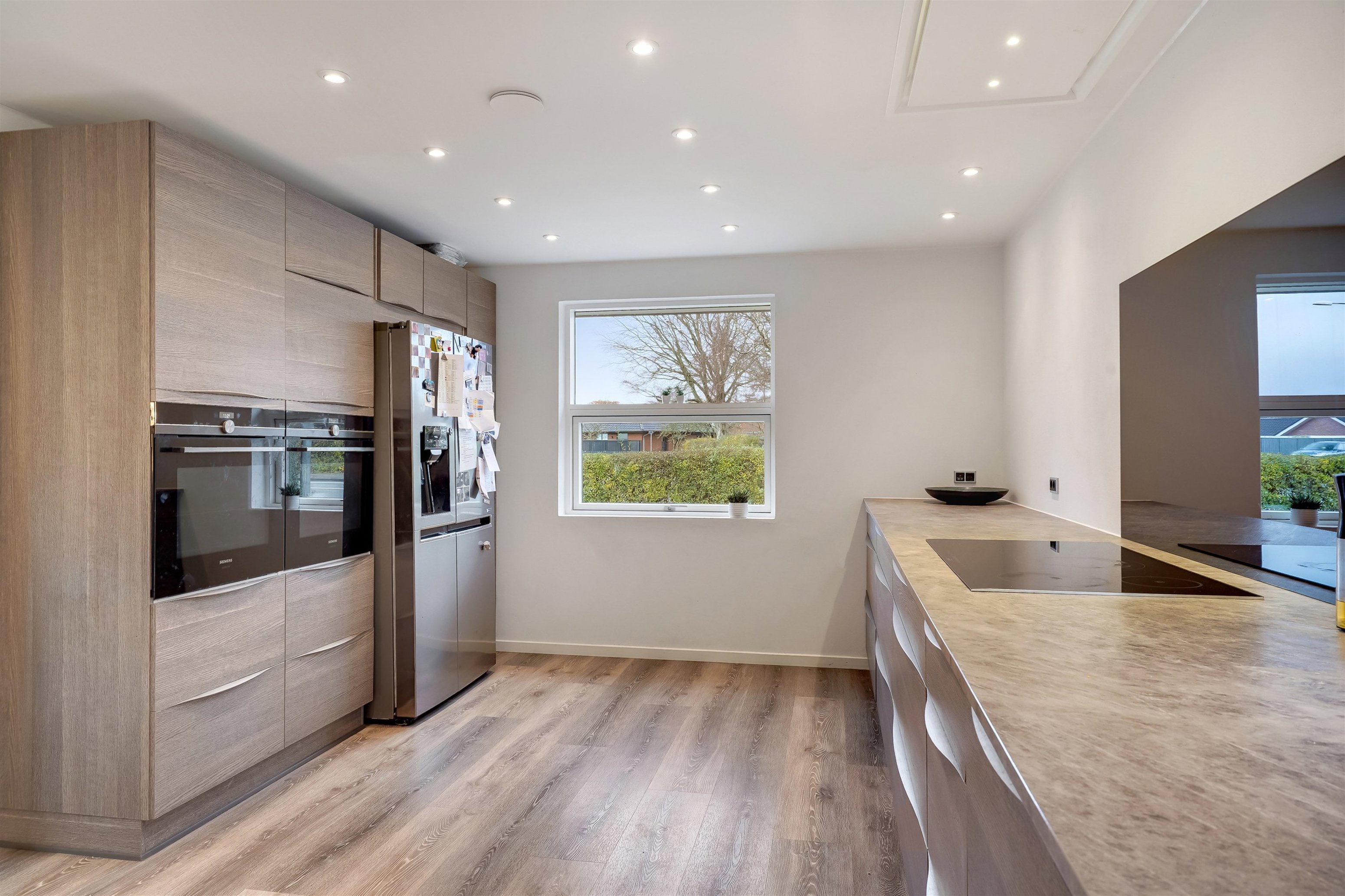 Indenfor byder boligen på en særdeles harmonisk planløsning, der kombinerer lys, funktionalitet og god plads. Det elegante køkken/alrum udgør hjertet i hjemmet – et rummeligt og lyst opholdsrum, hvor familien naturligt samles over madlavning, lektier eller hyggelige stunder. Herfra er der åben forbindelse til den indbydende stue, som med store vinduespartier giver et skønt lysindfald og direkte adgang til terrassen.