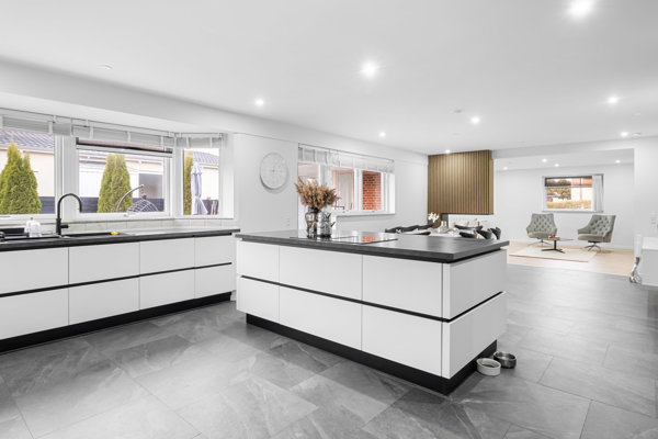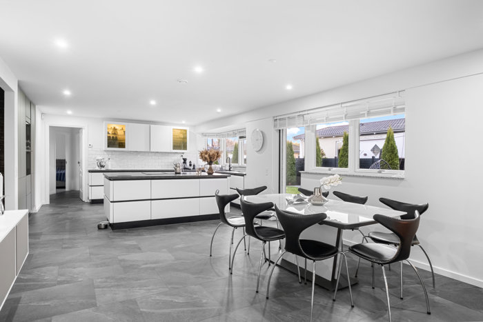 Boligen byder på en indbydende planløsning med store opholdsrum, hvor køkken, spisestue og stue flyder elegant sammen i et lyst og åbent miljø. Her finder du også fire gode soveværelser, to badeværelser, et funktionelt bryggers og masser af praktisk opbevaringsplads.