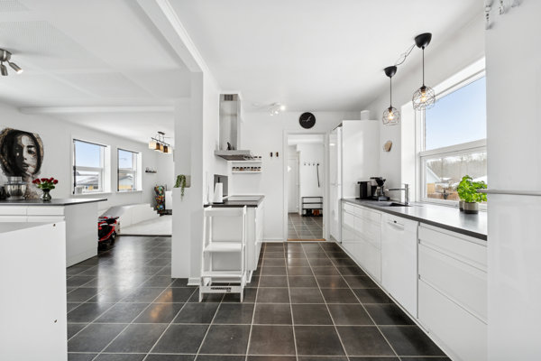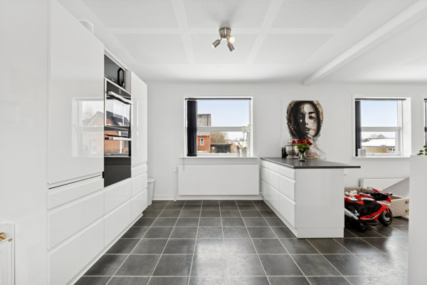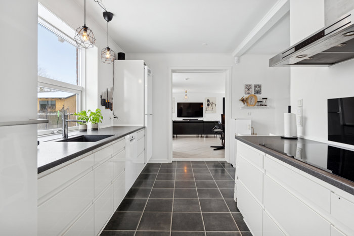 Inden døre fordeles hele 241 etagemeter på tre velindrettede etager med en anvendelsesrig og praktisk kælder forneden. Kælderen samler nemlig walk-in-closet, vaskerum og badeværelse side om side på bedste vis. Førstesalen er hjem for fire gode værelser, tre af dem har hems, og så er der også toilet heroppe. Stueetagen fordeler hjemmets store, lyse fællesarealer med et åbent køkken og en stor stue. Køkkenet er desuden veludstyret med en flytbar køkkenø.