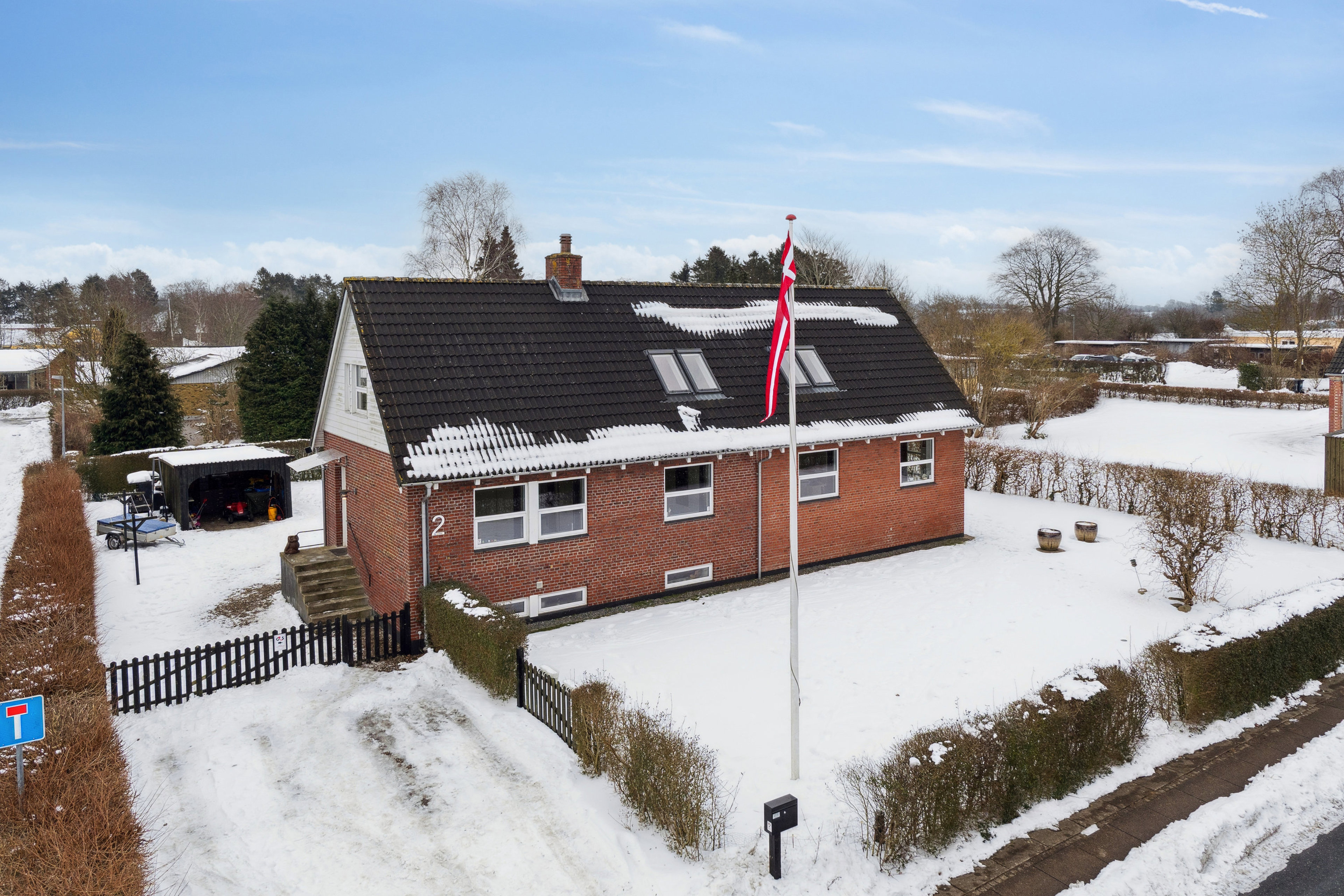 I modtages af et klassisk murstenshus fra 1954, som de seneste år er flot vedligeholdt og står knivskarpt. Haven er en af de ting, der er blevet ordnet og er rigtig nem at holde. Der er nemlig ryddet for buskads og i 2021 etableret græsplæne. Plænen indbyder til leg, og omkring det meste af huset er der en dejlig terrasse, mens indkørslen er belagt med perlesten.