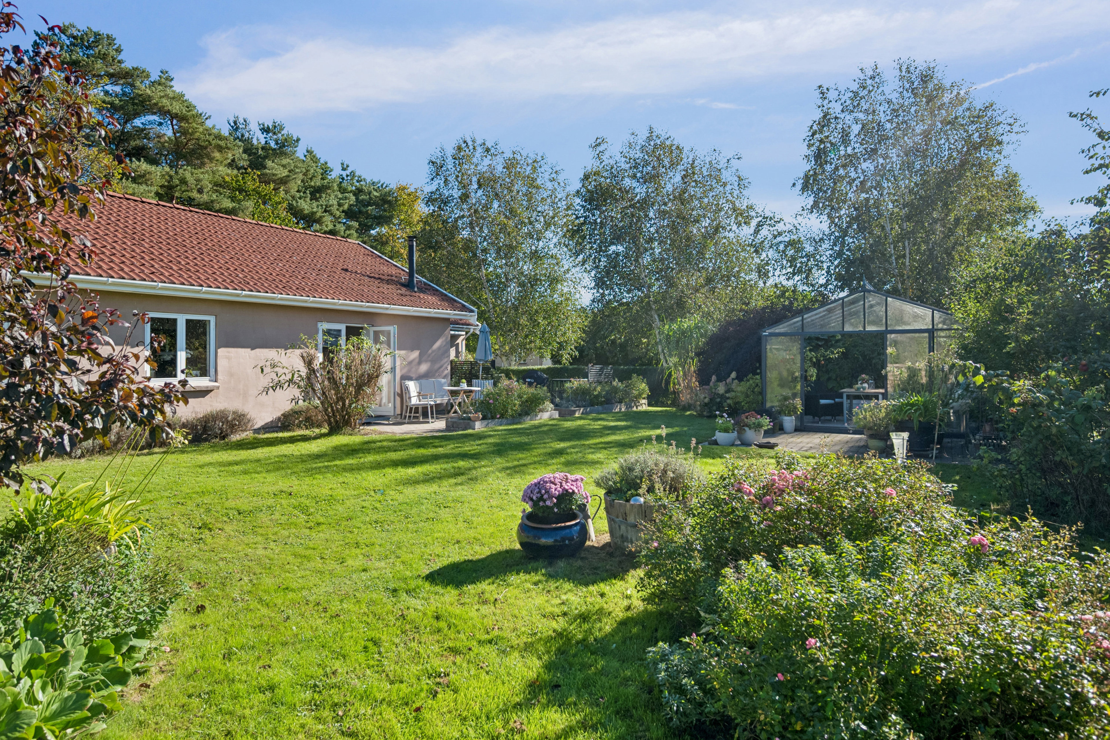 Men det er udenfor, at denne bolig virkelig folder sig ud. Haven er intet mindre end en sand oase – skabt med kærlighed til natur og detaljer. Her er både vilde blomster, grønne kroge og et væld af farver året rundt. Terrassen er indrettet med flere hyggelige zoner – fra det stemningsfulde grillområde til det imponerende orangeri, hvor du kan dyrke dine egne tomater, nyde et glas vin i skæret fra aftensolen eller forlænge sæsonen langt ind i efteråret.