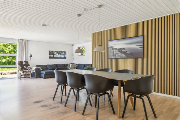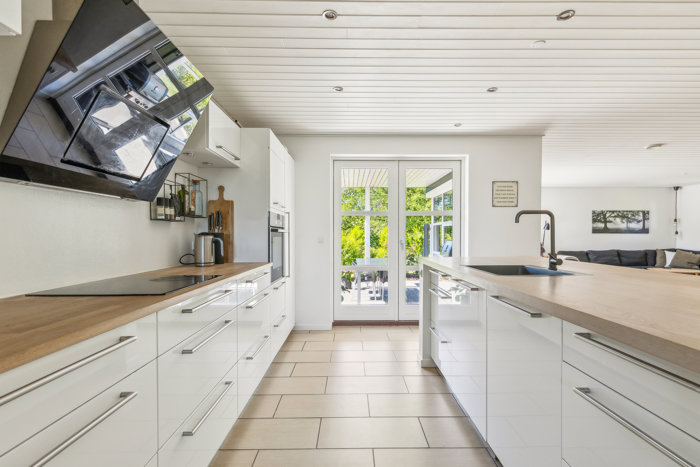 Boligens hjerte er det store, lyse opholdsrum, hvor køkken, spiseplads og stue smelter sammen i ét åbent og indbydende miljø. De store vinduespartier sikrer et fantastisk lysindfald samt en skøn forbindelse til haven og naturen udenfor. Køkkenet fremstår lyst og funktionelt og ligger i naturlig forlængelse af opholdsrummet, hvilket skaber de perfekte rammer for både hverdag og gæstebesøg.