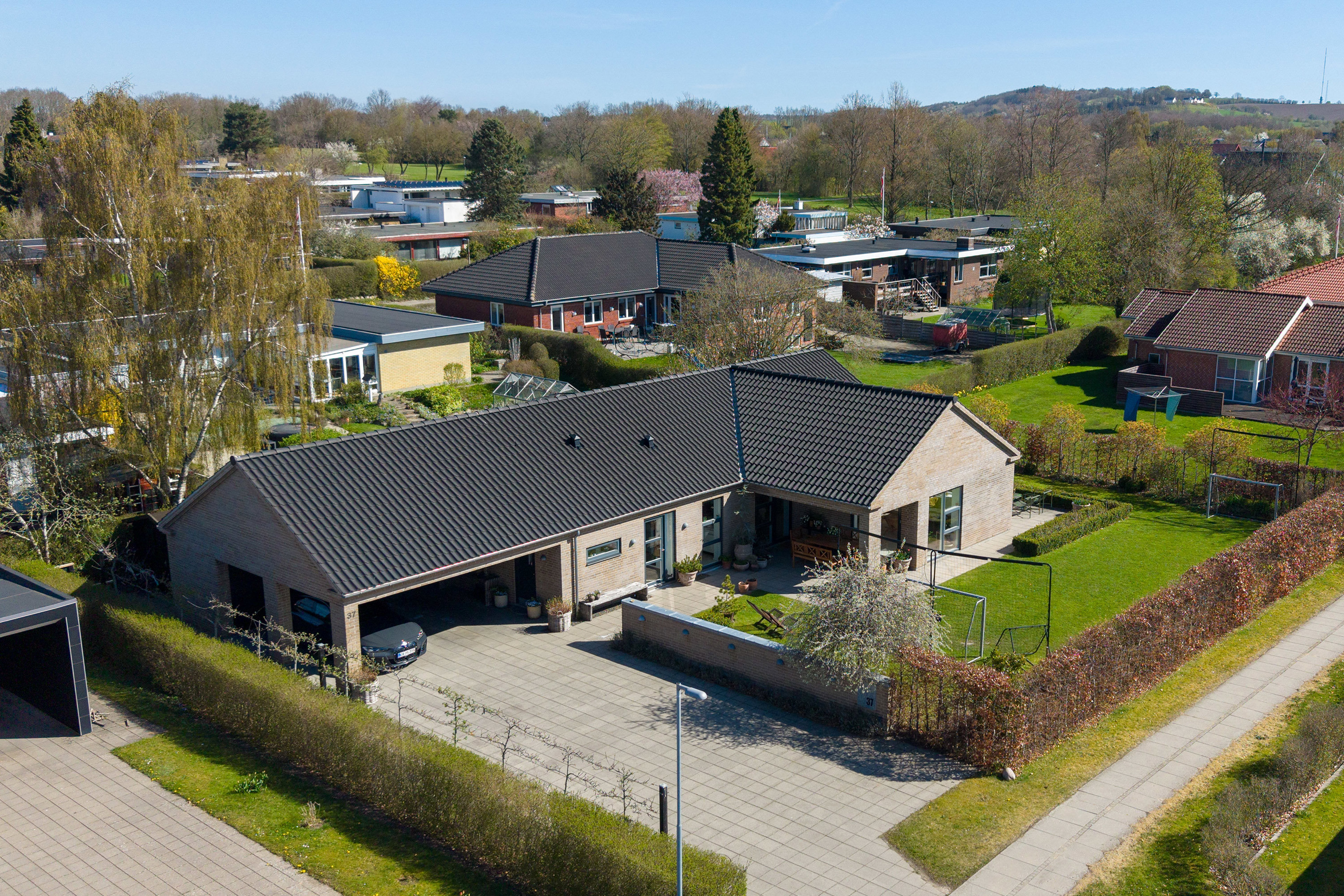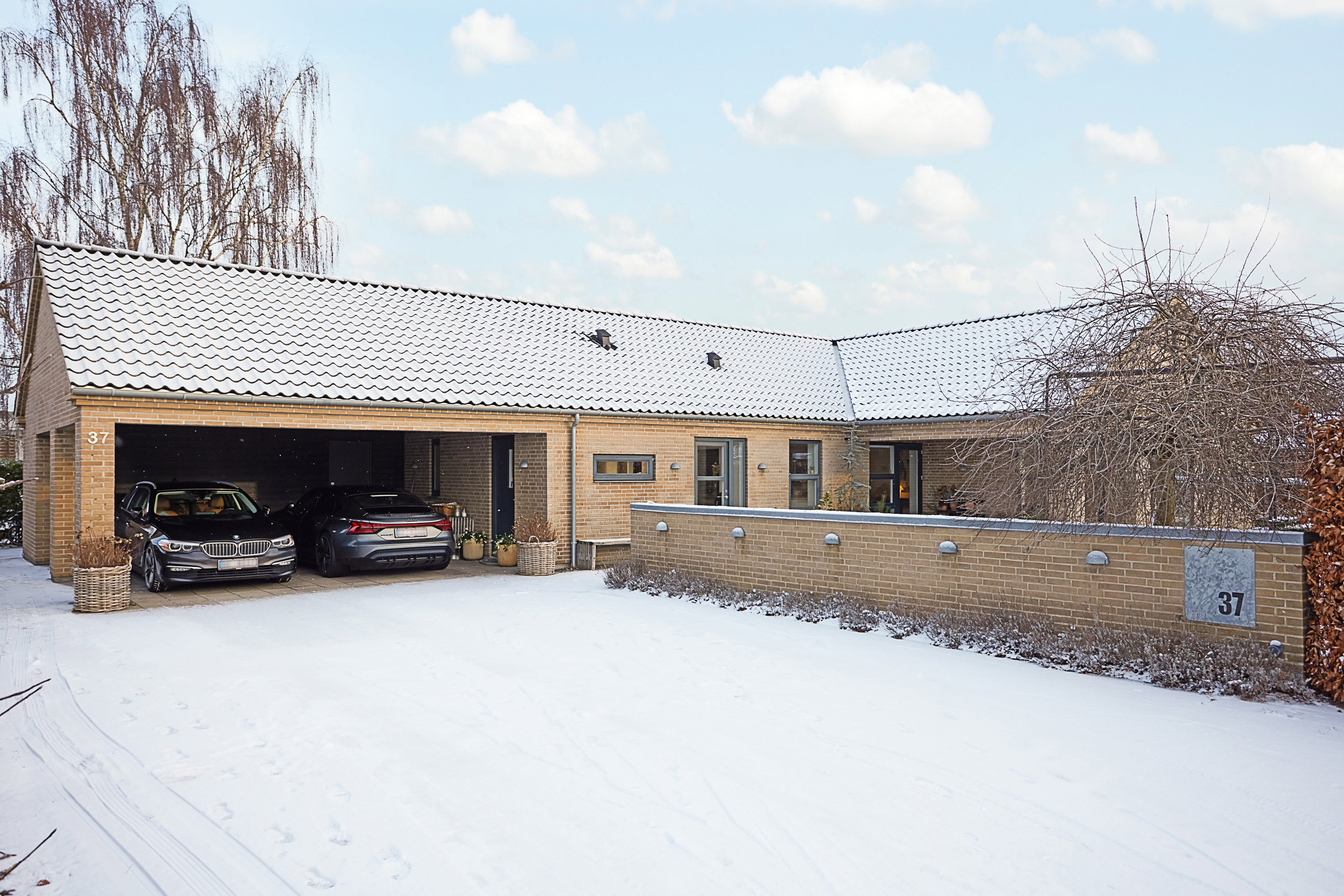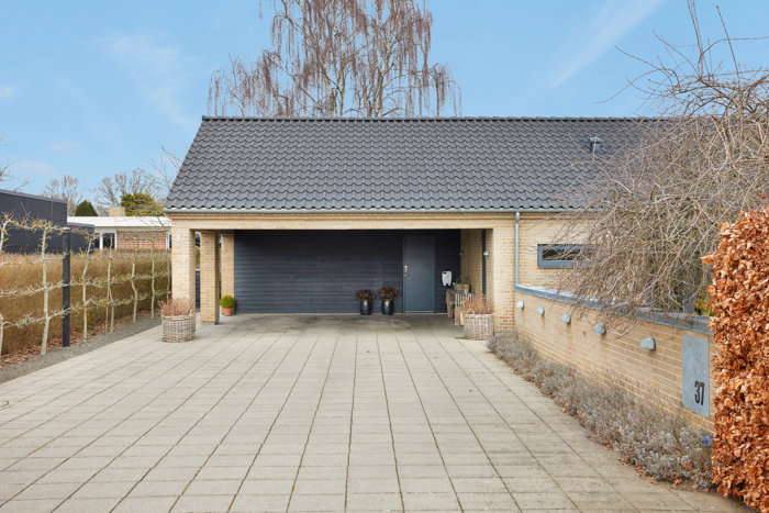 I forlængelse af huset samt den dobbelte carport er der et rummeligt og isoleret opbevaringsskur samt et fritliggende skur til haveredskaber. Dertil kommer en bred indkørsel med god plads til gæster eller et område der kan bruges til at spille basketball eller andre boldspil.