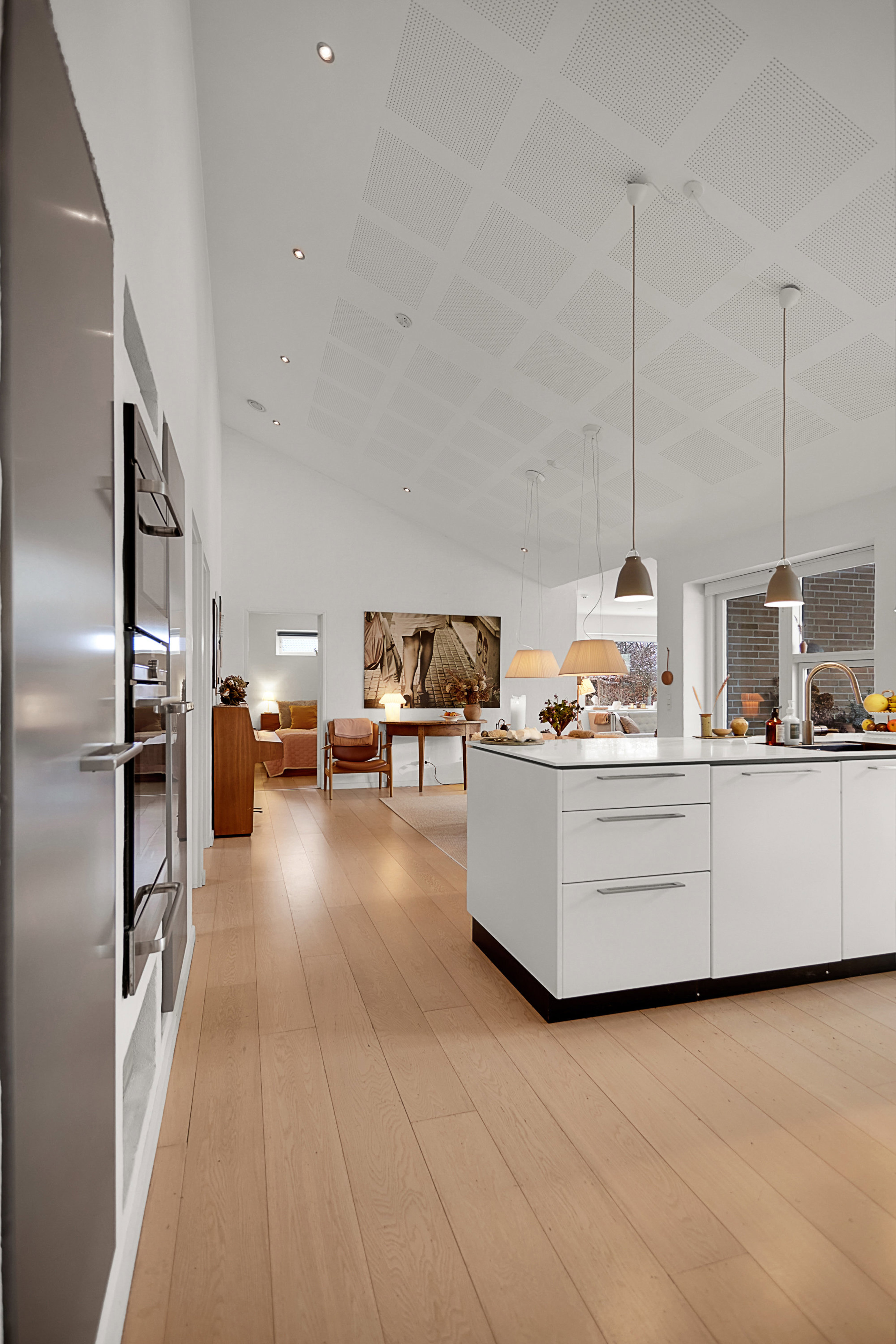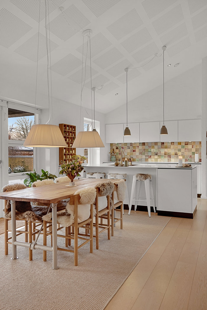 I midten af huset finder man husets hjerte: det store køkken-alrum, hvor der er ekstra loftshøjde, akustikloft og store vinduer mod haven. Her er der god plads til, at familien kan samles, lave mad og hygge sig i det lækre køkken med hvide fronter, god skabsplads, hvid corian-bordplade samt håndlavede fliser. Fra alrummet er der udgang til en hyggelig, overdækket terrasse orienteret mod sydvest – oplagt til de lange sommeraftener, og hvor man trygt kan sidde i ly for regnen.