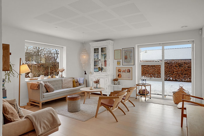 Fra alrummet er der adgang til en dejlig stue med et fantastisk lysindfald fra de mange store vinduer og god plads til tv- og sofagruppe. Haven kan frit betragtes fra både stue og køkken-alrum, og man får følelsen af, at den ”kommer ind i huset”.