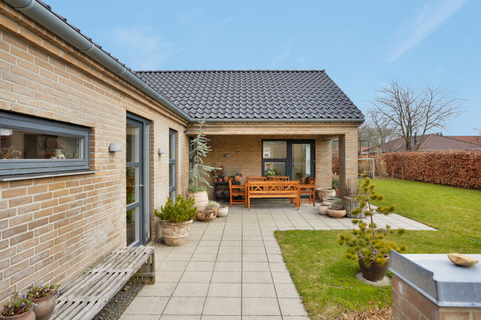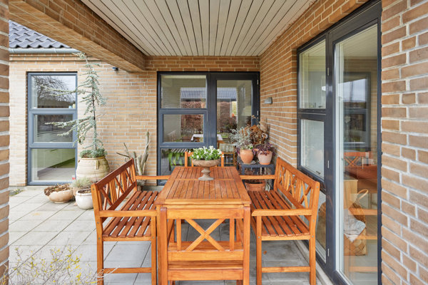 På den østlige side af huset er der anlagt en god morgenterrasse.