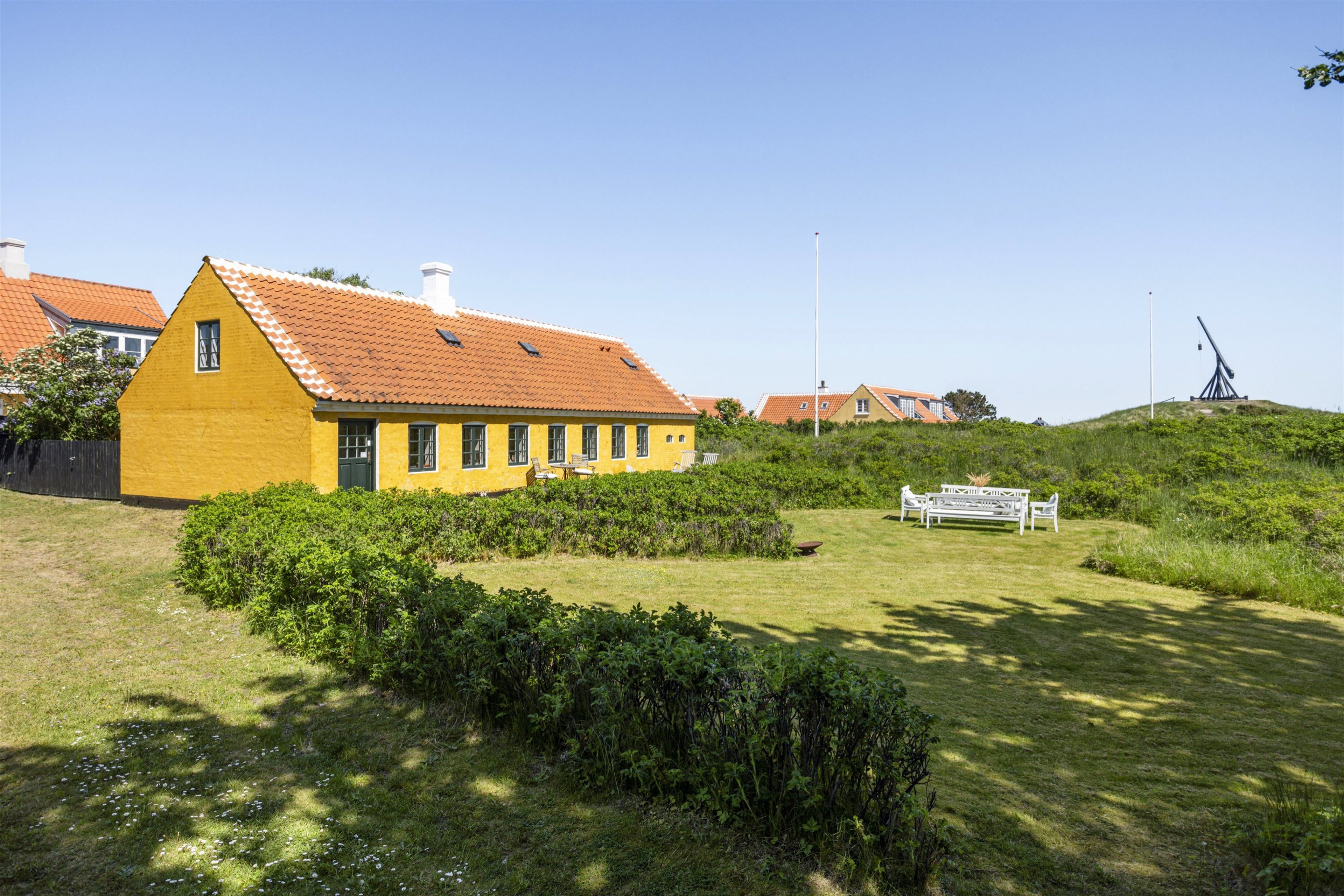 Ligeledes er den lettere kuperet grund et kapitel for sig. Forhaven byder på afskærmet beplantning mod vejen, en uforstyrret 'klitfordybning' med læ og med Vippefyret som nærmeste nabo samt, en hyggelig indkørsel ind til det tilbagetrukket længehus. Bag huset en skøn gårdhave med udhusbygning og træbeplantning.