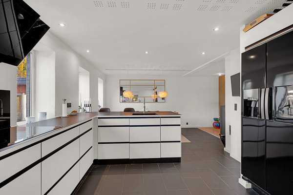 Indenfor mødes I af en lys og velkomstvenlig entre, der giver et førstehåndsindtryk af kvalitet og stil. Herfra er der adgang til husets opholdsrum, hvor køkken og stue ligger i naturlig sammenhæng – perfekt til hverdagslivet, lektier ved bordet og gæster omkring middagen. På førstesalen åbner den ekstra loftshøjde rummene op og skaber en unik atmosfære, som både voksne og børn vil elske at opholde sig i.