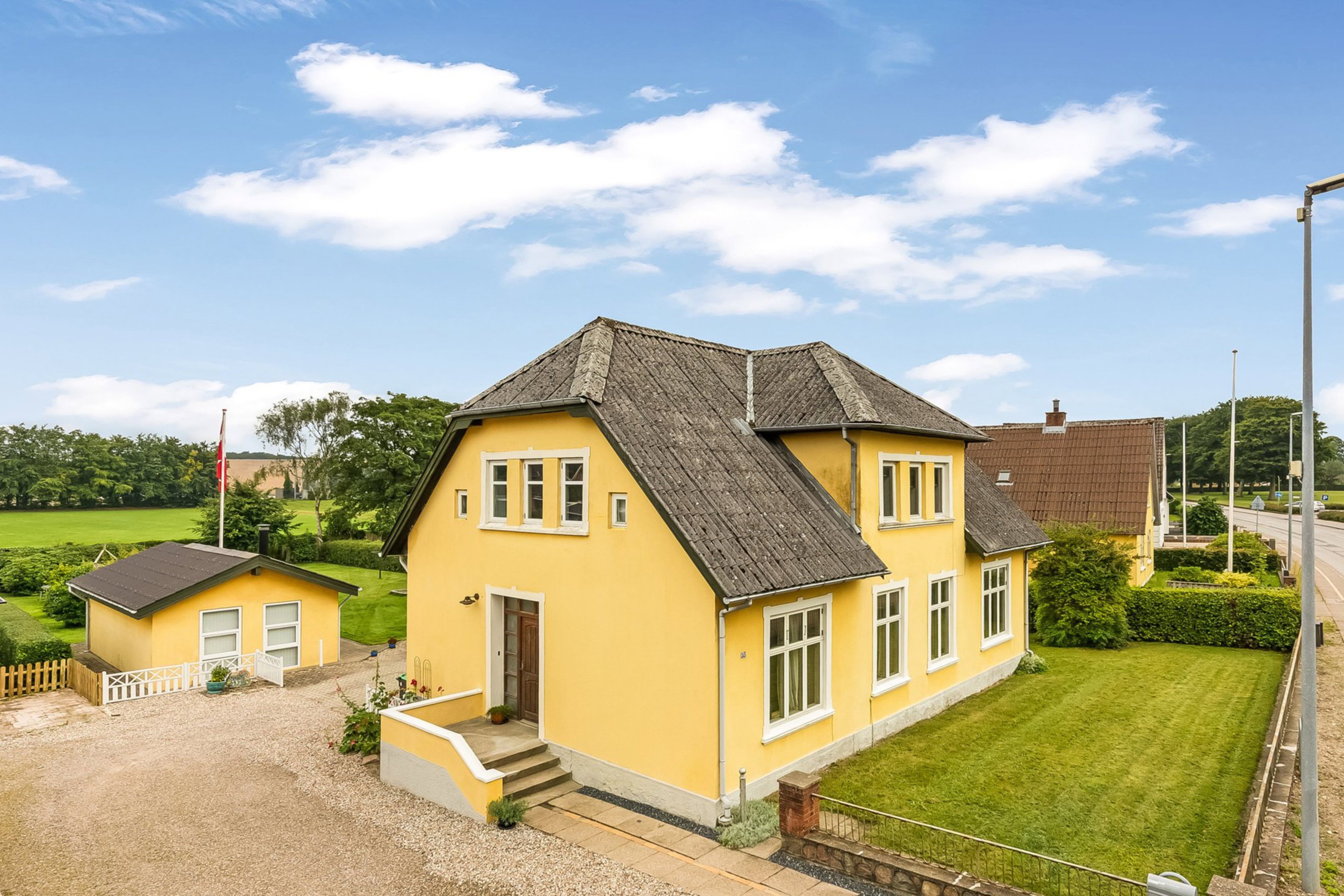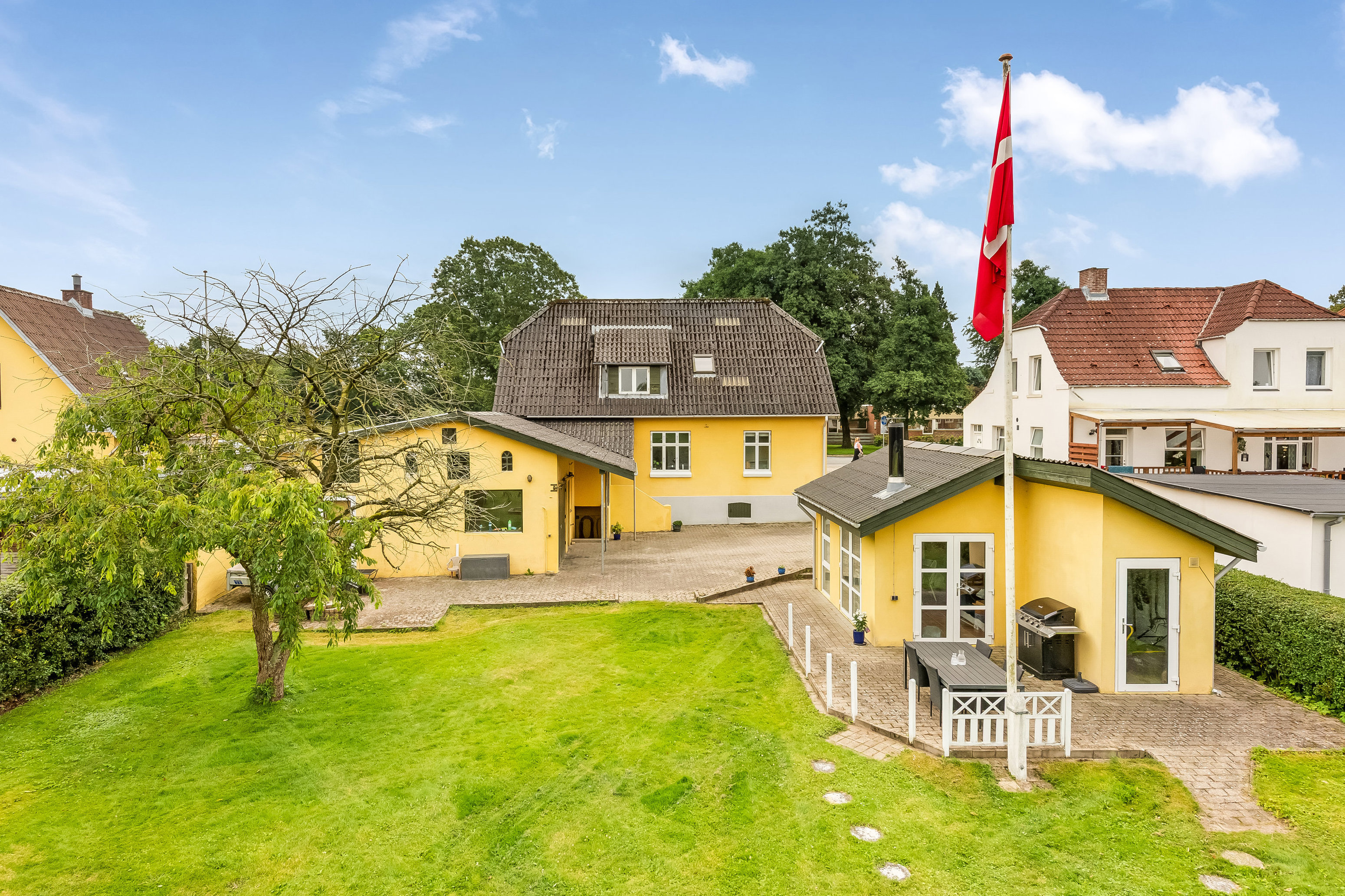 Villaen er beliggende ved byens centrale vej, hvilket giver en attraktiv og tilgængelig placering og med en ro, der overrasker i forhold til beliggenheden.