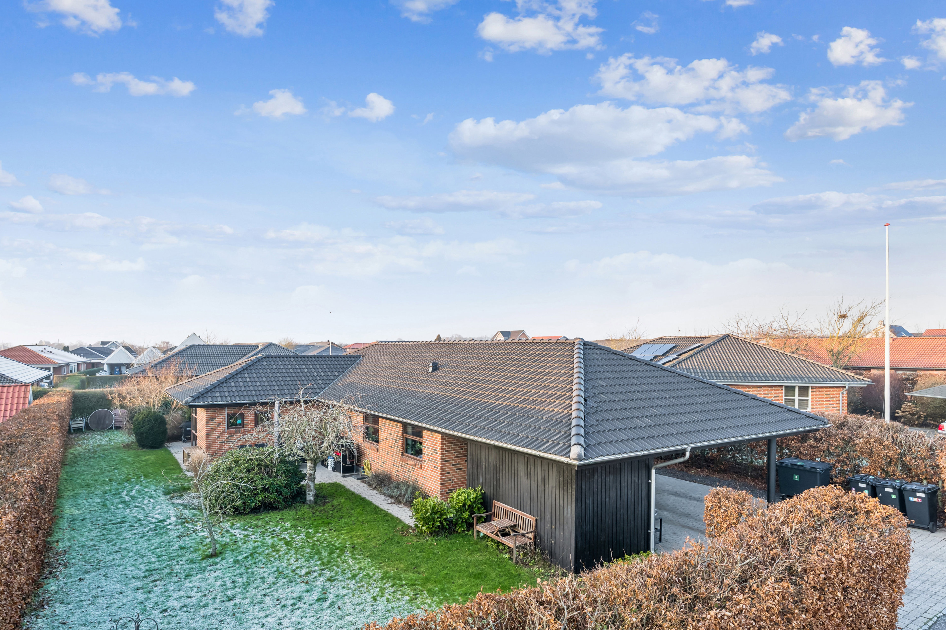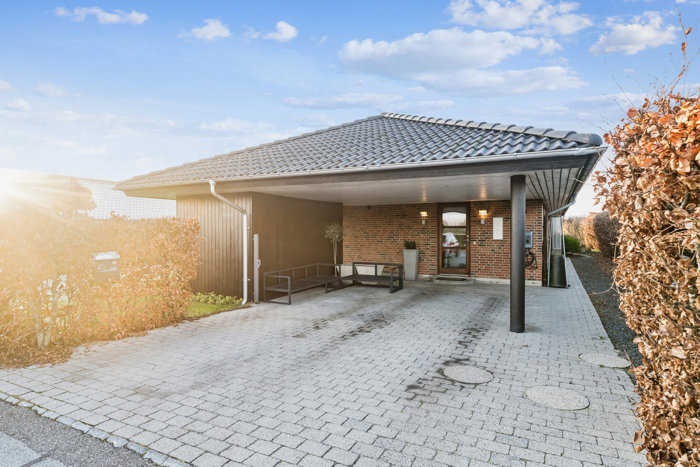 Ved ankomst mødes I af en bred indkørsel med integreret carport, samt adgang til redskabsskur/værksted. I carporten er der i 2025 opsat en Clever, 11 kW elbil-lader, som medfølger boligen. Der er både en indbydende entré og en praktisk bryggersindgang med vaskefaciliteter og god opbevaringsplads.